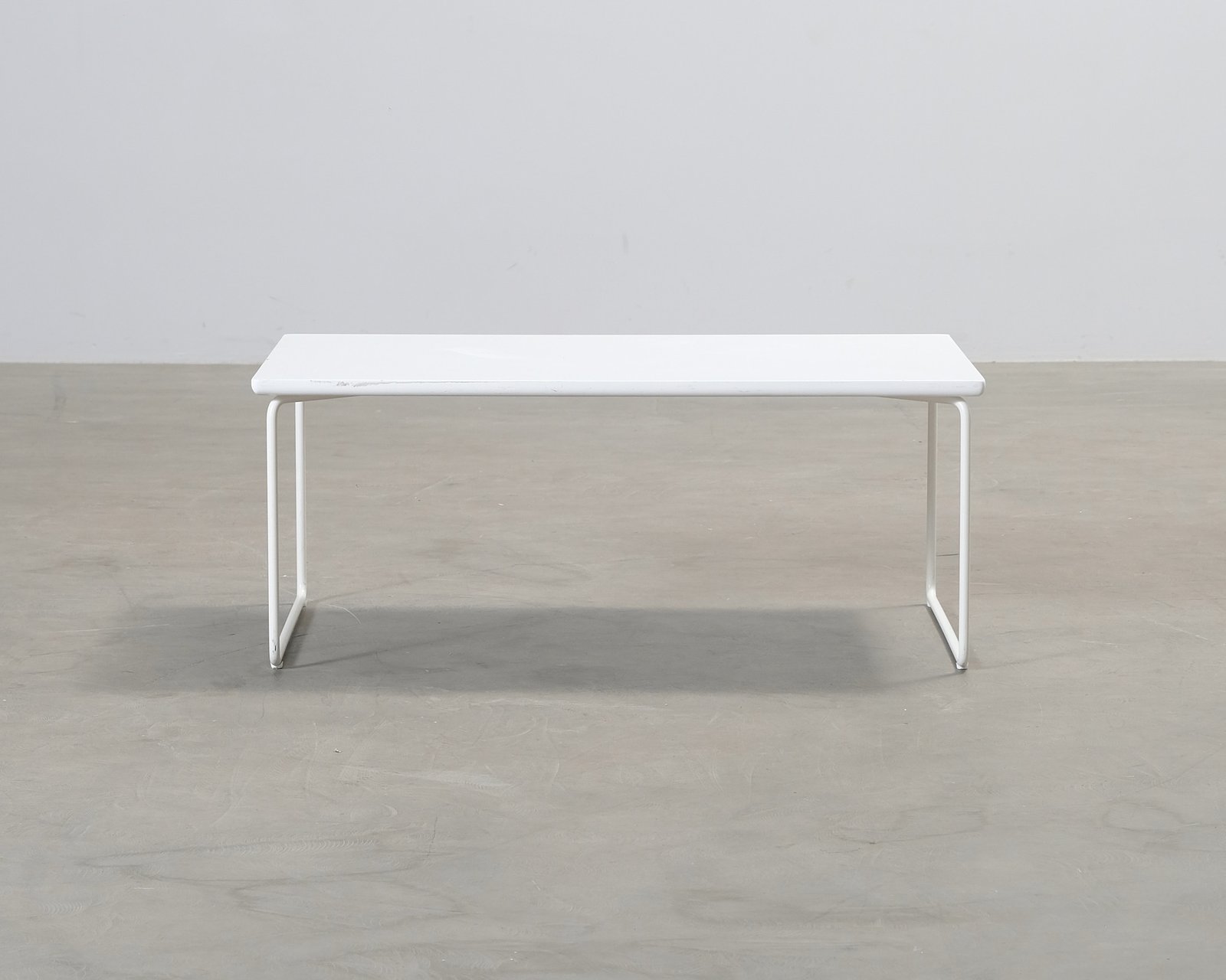 Adeas vita Band soffbord med rektangulär bordsskiva. Ben i metall. Repor och bucklor på bordsskivans ytor. Slitage och sprickor på kanterna.