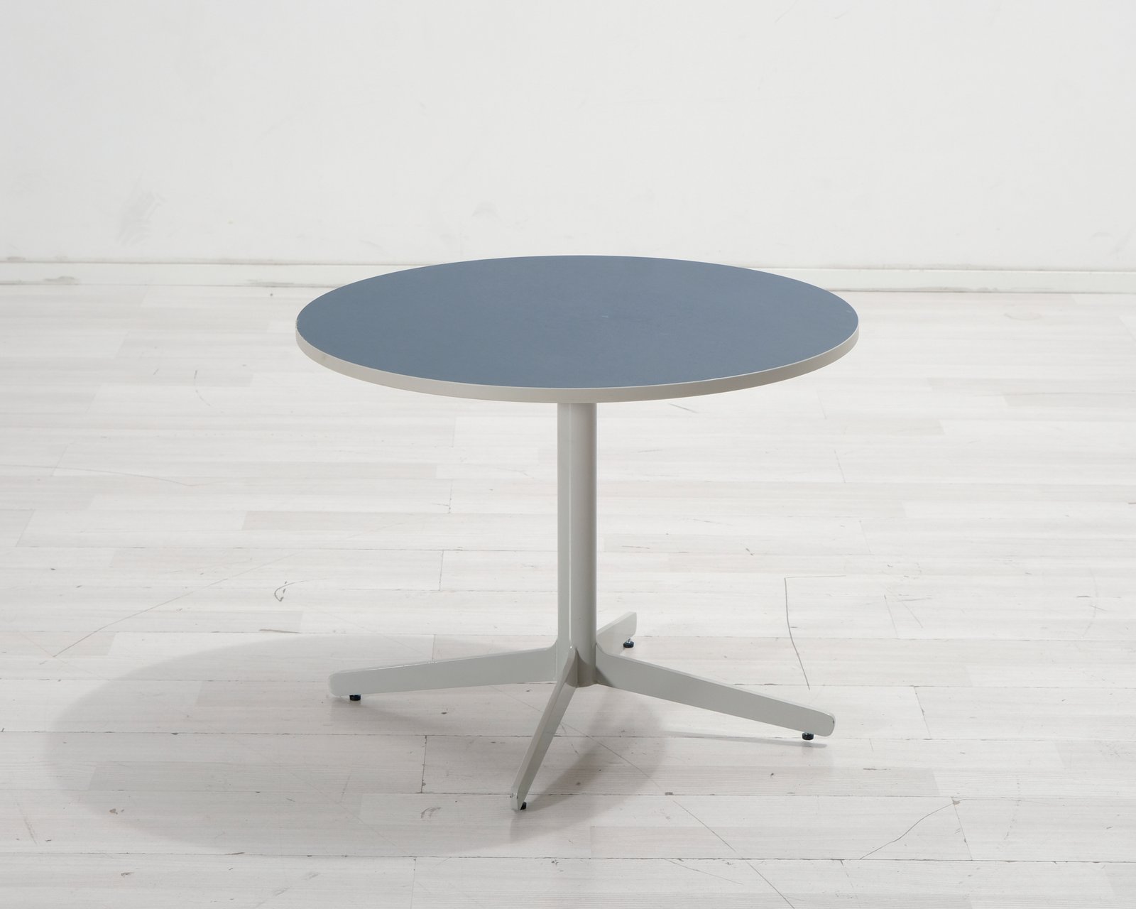 Soffbord med metallfot tillverkad av Adea. Mörkblå bordsskiva. Repor och slitage på kanterna av bordsskivan.