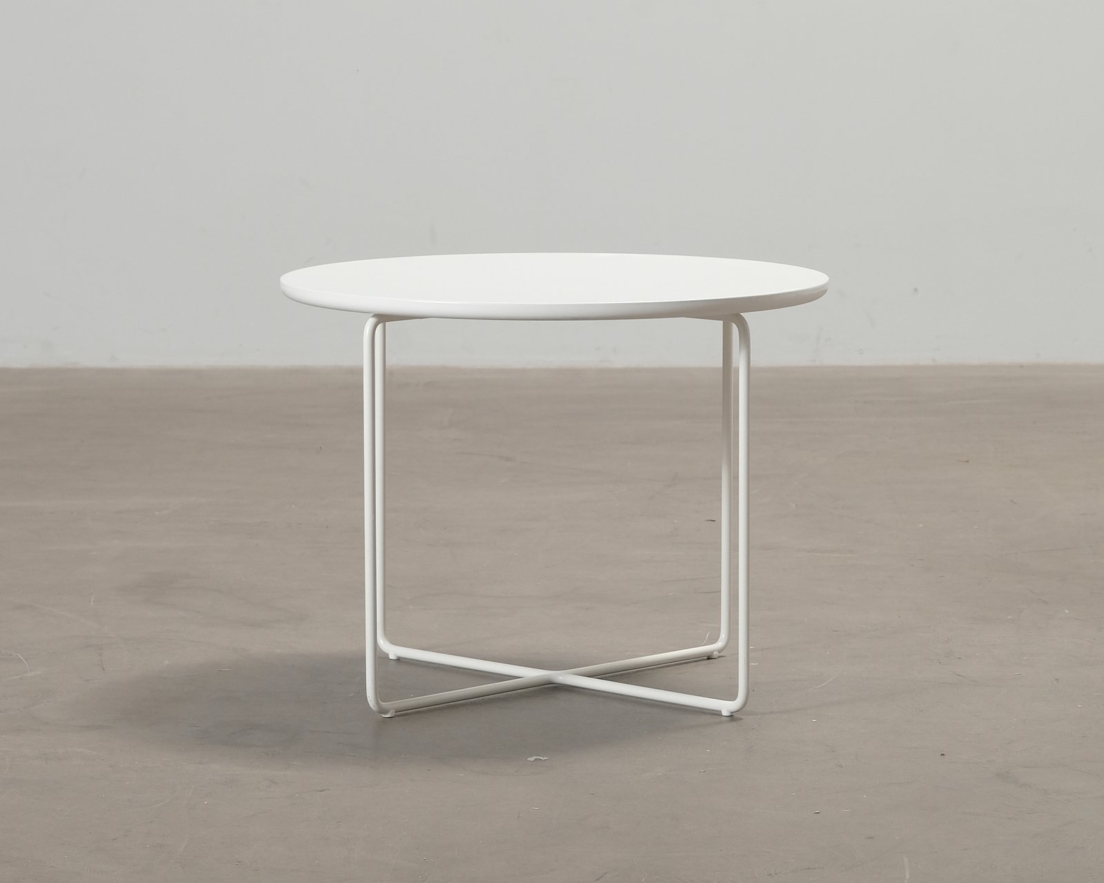 Adeas vita soffbord med rund bordsskiva. Ben i metall. Betydande slitage överallt.