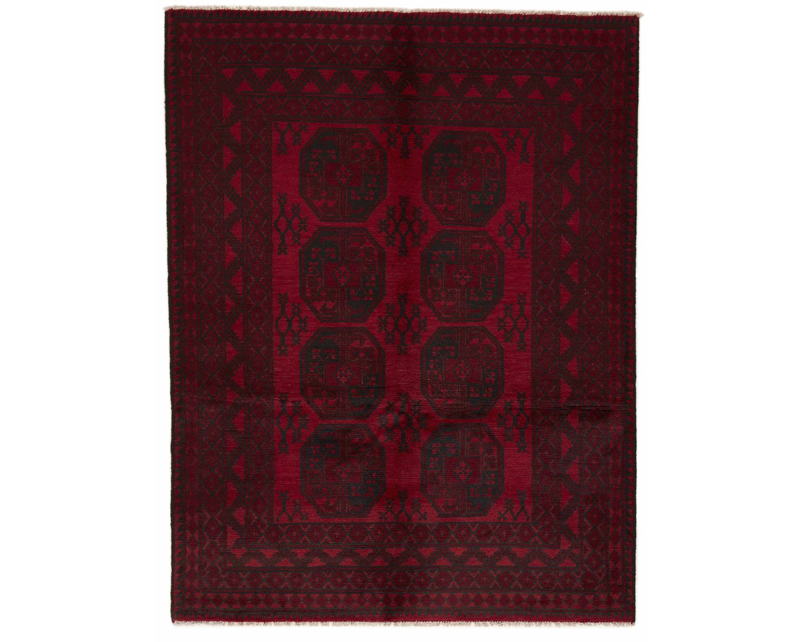 Aktscha-mattorna är handknutna och utmärks av en djup, varm röd bottenfärg samt en robust yta med relativt hög lugg. De är tillverkade av en blandning av ull, gethår och hästhår. Det dominerande motivet är Gül, även känt som Elefantfotmönstret. Den lägre knuttätheten på 50 000–150 000 knutar per kvadratmeter ger mattan ett kraftfullt och stadigt uttryck. Oanvänd.