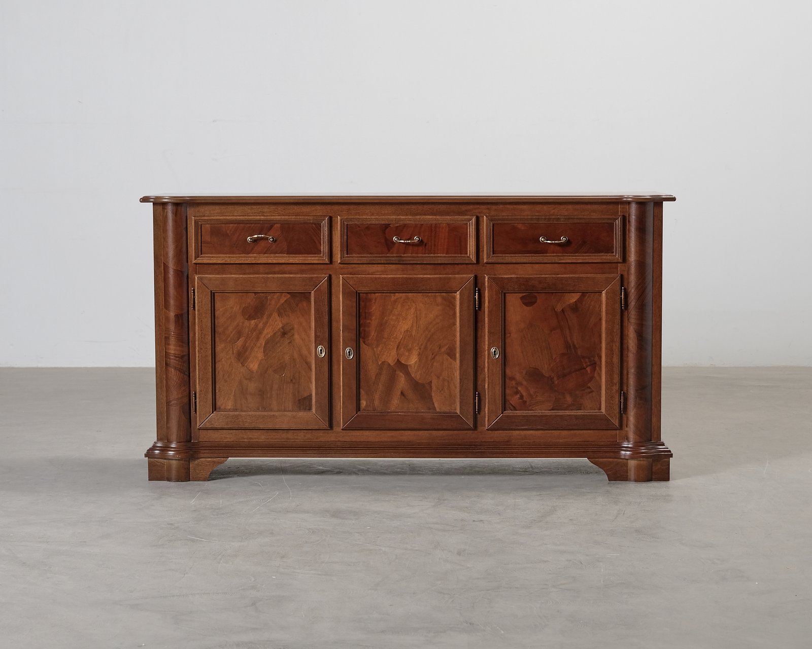 En vacker skänk i trä som erbjuder bra förvaringsutrymme och fantastiska detaljer för att skapa en klassisk känsla i inredningen. Lackytan på skänken är något ojämn. Små sprickor på bordsskivan och framsidan av vänster ben. Nycklar till skåpen medföljer. Helhetsintrycket är bra.