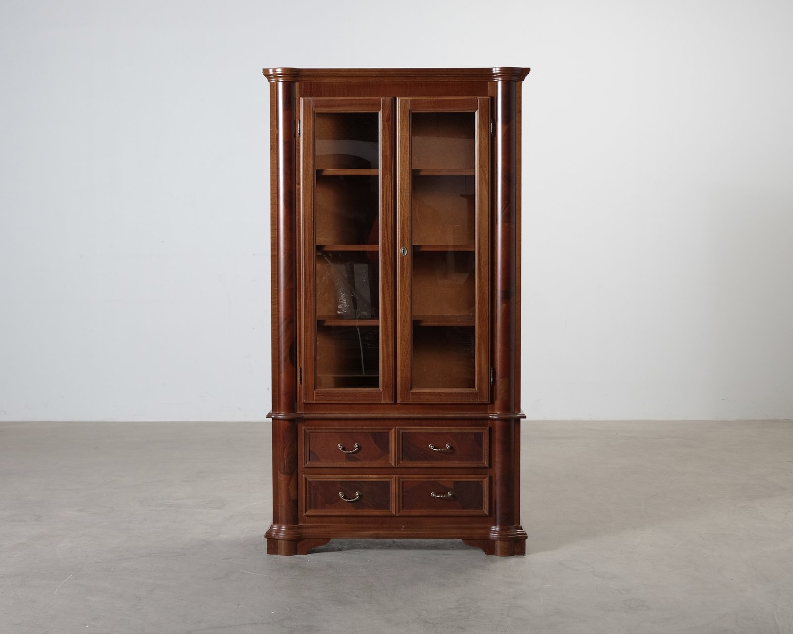 Ett vackert vitrinskåp i trä med fantastiska detaljer som skapar en klassisk look för din inredning. Vitrinskåpet ger gott om förvaringsutrymme och glasdörrarna gör att du kan visa upp föremål i t.ex. vardagsrummet eller köket. Repa på högra dörren, och vitrinskåpet vickar lite. Helhetsintrycket är fint.