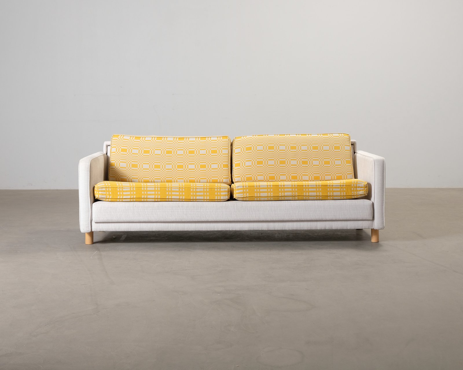 Artek 550 är en tidlös tresitssoffa som enkelt kan omvandlas till en säng. Soffans eleganta utseende skapas av dess slanka rygg- och armstöd samt sittdynor klädda i Johanna Gullichsens tyg Nereus. Soffans ram är tillverkad av trä och har ben av massiv björk. Små spår av användning, lätt slitage på benen och lite ludd på kuddarna. Helhetsintrycket är bra.