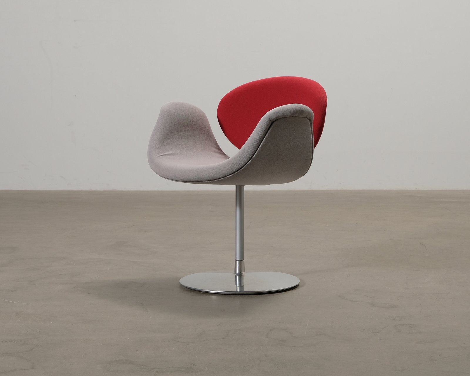 Tulip är en ikonisk stol som designades av Pierre Paul för Artifort 1960. Tulip-stolens skulpturala utseende skapas av metallbasen och den vackert formade sitsen, vars böjda konturer också gör den ergonomisk och bekväm att sitta på. Stolen har en vridbar sits, vilket gör den idealisk för mötesrum, men också som matbordsstol i privata hem. Repor på benet och lite ludd på sitsen. Helhetsintrycket är bra.