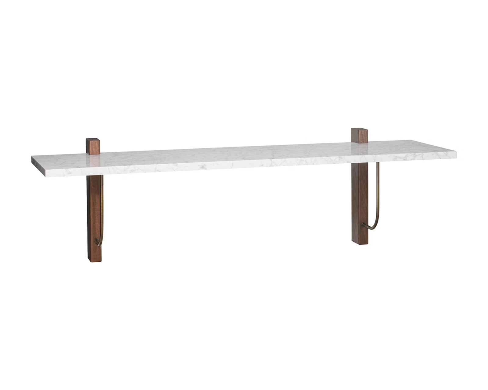 Audo Copenhagen Corbel‑vägghylla kombinerar arkitektonisk inspiration med förfinade material och skapar en minimalistisk men skulptural vägghängd förvaringslösning. Corbel‑vägghyllan är designad av Krøyer‑Sætter‑Lassen och har en vit Carrara‑marmorskiva som stöds av en mörkbehandlad ekram och bronsfärgade metallbeslag.