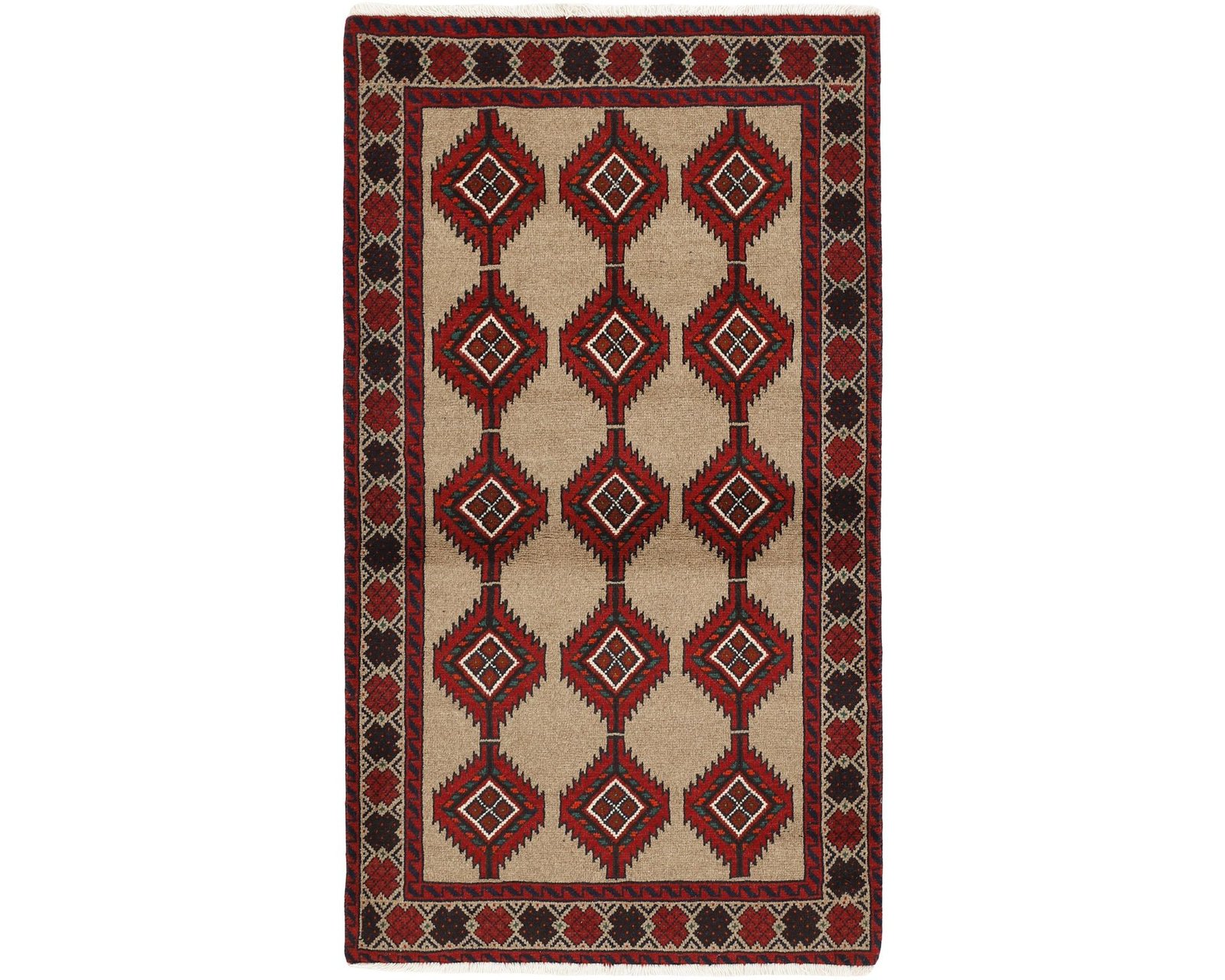 Balutch-mattorna kännetecknas av geometriska former och kompakta kompositioner. Mönstren består ofta av enkla geometriska motiv eller rutliknande uppbyggnader, och ibland förekommer även figurativa element som fåglar eller människor. Färgskalan domineras av djupa röda nyanser, mörkblått och vitt. Mattorna är handknutna av 100 % ull, med en knuttäthet som varierar mellan 50 000 och 150 000 knutar per kvadratmeter. Oanvänd.