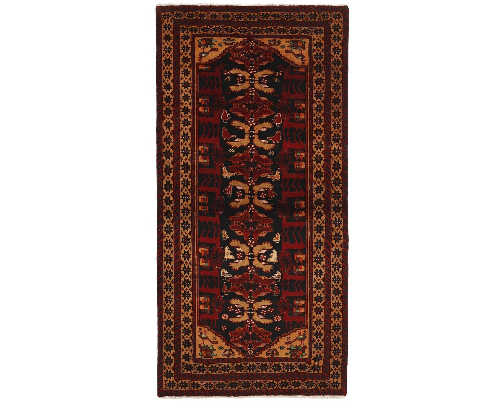 Balutch-mattorna kännetecknas av geometriska former och kompakta kompositioner. Mönstren består ofta av enkla geometriska motiv eller rutliknande uppbyggnader, och ibland förekommer även figurativa element som fåglar eller människor. Färgskalan domineras av djupa röda nyanser, mörkblått och vitt. Mattorna är handknutna av 100 % ull, med en knuttäthet som varierar mellan 50 000 och 150 000 knutar per kvadratmeter. Oanvänd.