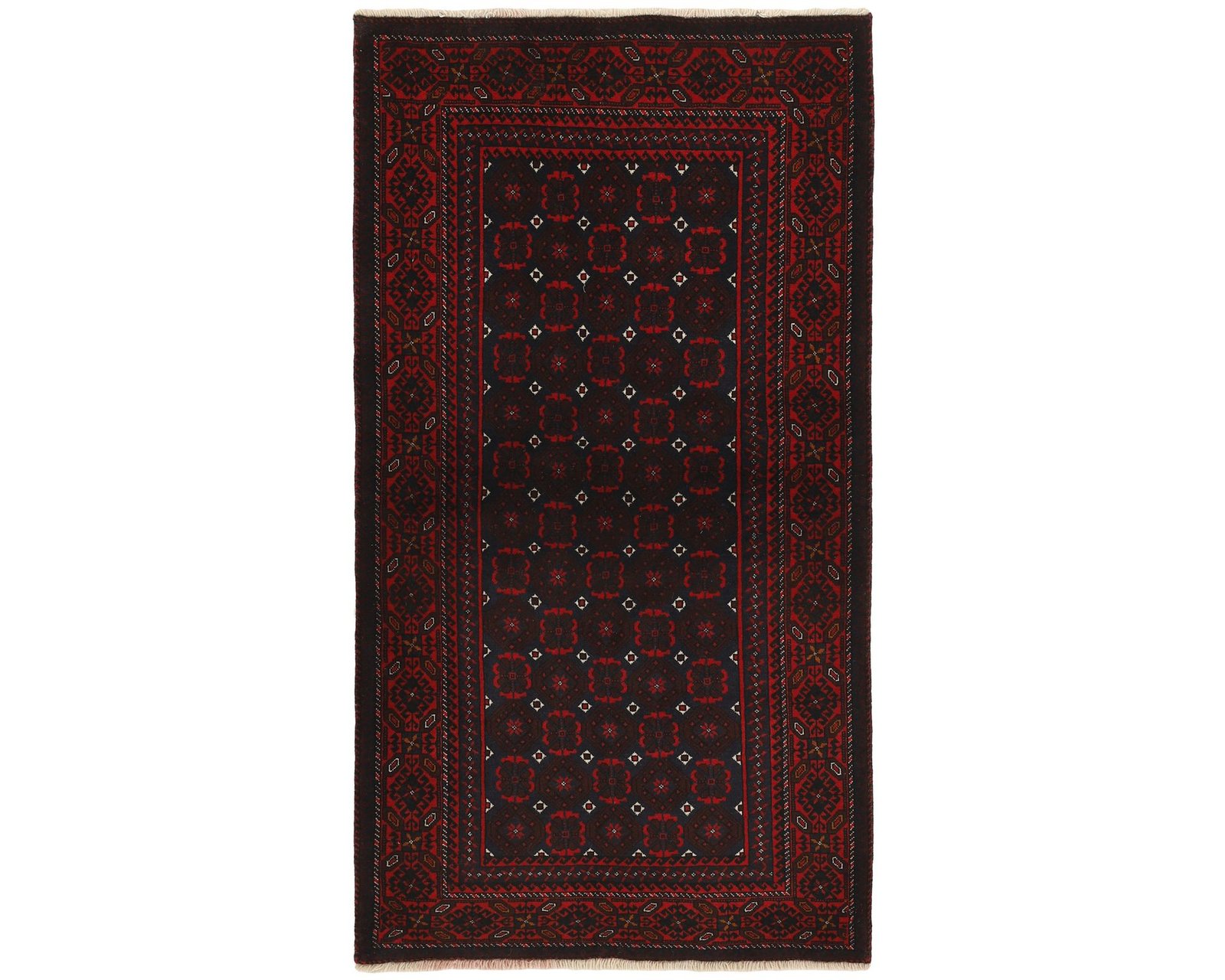 Balutch-mattorna kännetecknas av geometriska former och kompakta kompositioner. Mönstren består ofta av enkla geometriska motiv eller rutliknande uppbyggnader, och ibland förekommer även figurativa element som fåglar eller människor. Färgskalan domineras av djupa röda nyanser, mörkblått och vitt. Mattorna är handknutna av 100 % ull, med en knuttäthet som varierar mellan 50 000 och 150 000 knutar per kvadratmeter. Oanvänd.