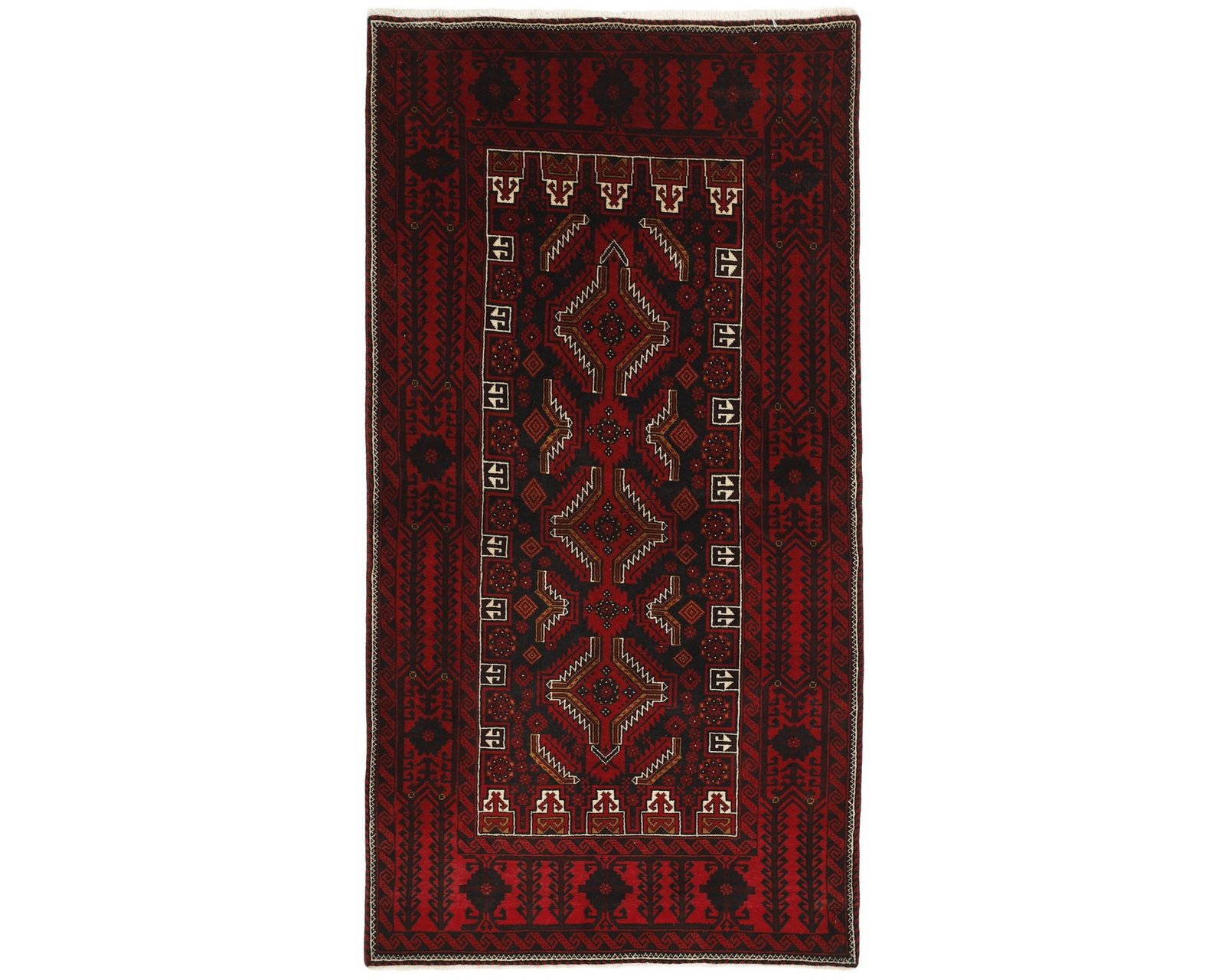 Balutch-mattorna kännetecknas av geometriska former och kompakta kompositioner. Mönstren består ofta av enkla geometriska motiv eller rutliknande uppbyggnader, och ibland förekommer även figurativa element som fåglar eller människor. Färgskalan domineras av djupa röda nyanser, mörkblått och vitt. Mattorna är handknutna av 100 % ull, med en knuttäthet som varierar mellan 50 000 och 150 000 knutar per kvadratmeter. Oanvänd.