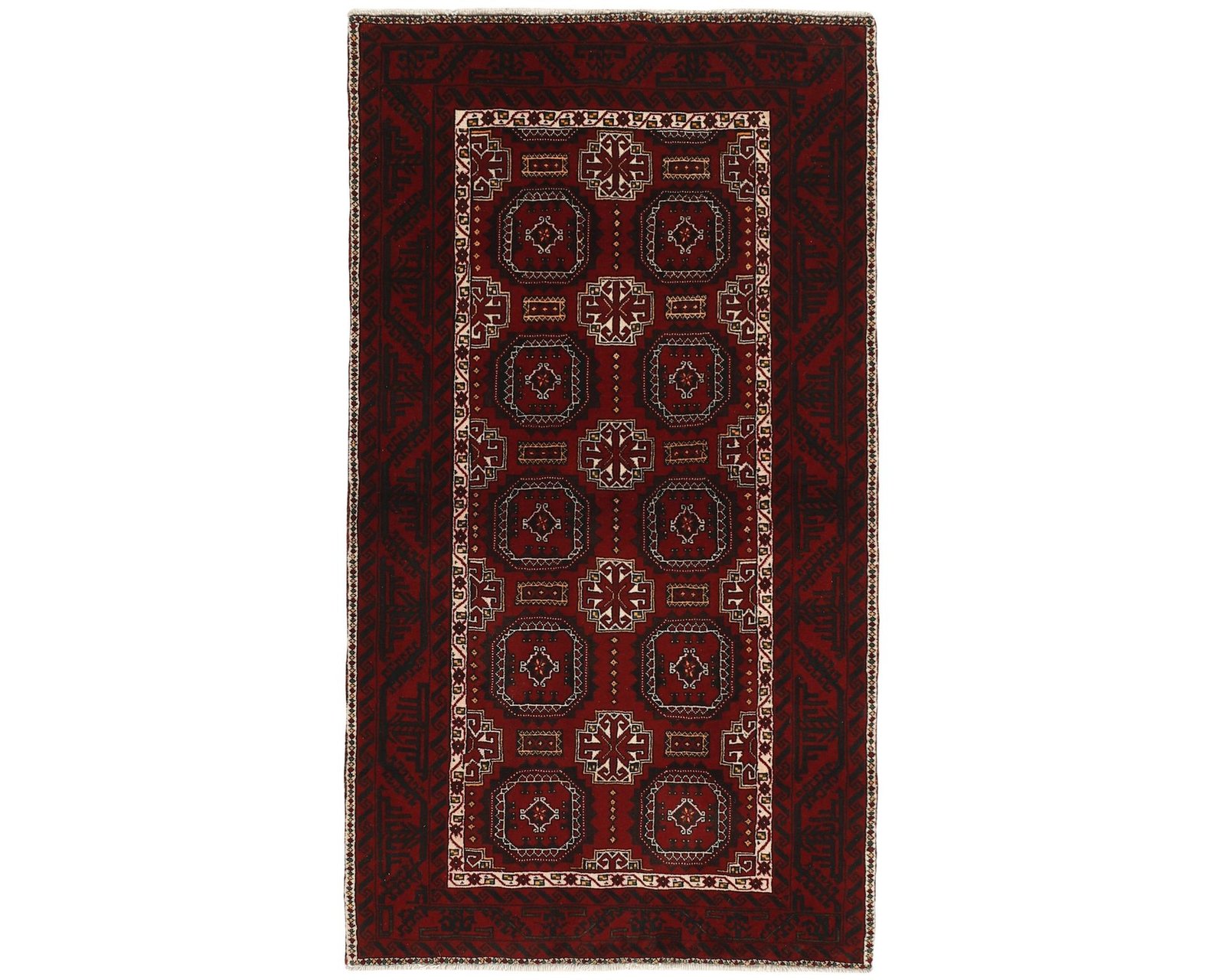 Balutch-mattorna kännetecknas av geometriska former och kompakta kompositioner. Mönstren består ofta av enkla geometriska motiv eller rutliknande uppbyggnader, och ibland förekommer även figurativa element som fåglar eller människor. Färgskalan domineras av djupa röda nyanser, mörkblått och vitt. Mattorna är handknutna av 100 % ull, med en knuttäthet som varierar mellan 50 000 och 150 000 knutar per kvadratmeter. Oanvänd.