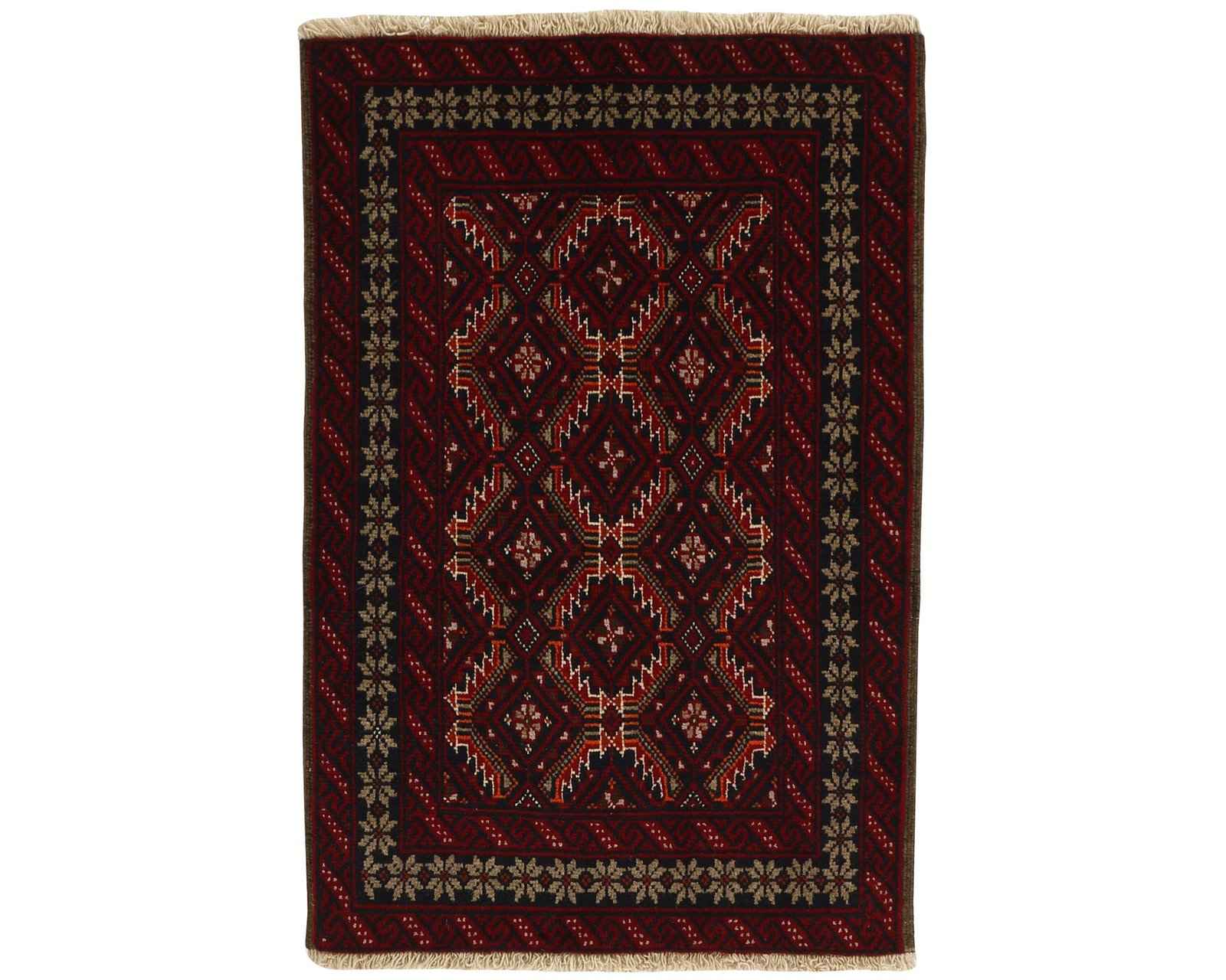 Balutch-mattorna kännetecknas av geometriska former och kompakta kompositioner. Mönstren består ofta av enkla geometriska motiv eller rutliknande uppbyggnader, och ibland förekommer även figurativa element som fåglar eller människor. Färgskalan domineras av djupa röda nyanser, mörkblått och vitt. Mattorna är handknutna av 100 % ull, med en knuttäthet som varierar mellan 50 000 och 150 000 knutar per kvadratmeter. Oanvänd.