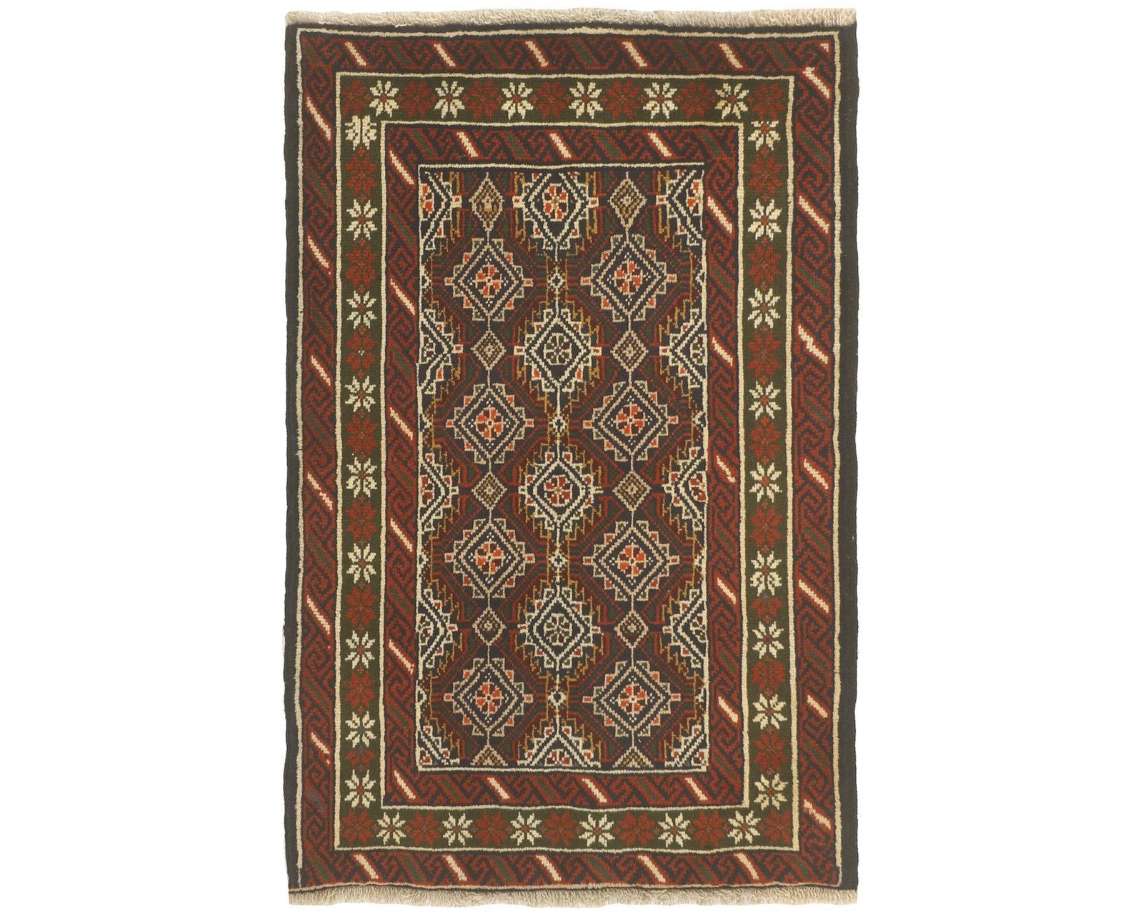 Balutch-mattorna kännetecknas av geometriska former och kompakta kompositioner. Mönstren består ofta av enkla geometriska motiv eller rutliknande uppbyggnader, och ibland förekommer även figurativa element som fåglar eller människor. Färgskalan domineras av djupa röda nyanser, mörkblått och vitt. Mattorna är handknutna av 100 % ull, med en knuttäthet som varierar mellan 50 000 och 150 000 knutar per kvadratmeter. Oanvänd.