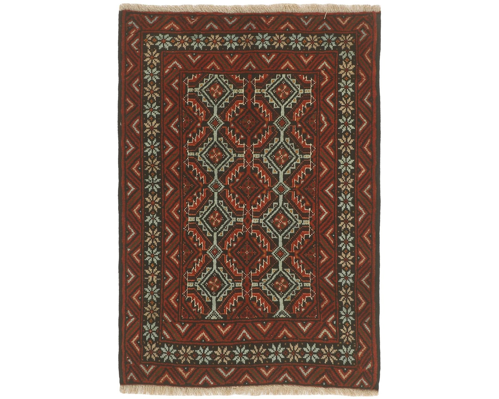 Balutch-mattorna kännetecknas av geometriska former och kompakta kompositioner. Mönstren består ofta av enkla geometriska motiv eller rutliknande uppbyggnader, och ibland förekommer även figurativa element som fåglar eller människor. Färgskalan domineras av djupa röda nyanser, mörkblått och vitt. Mattorna är handknutna av 100 % ull, med en knuttäthet som varierar mellan 50 000 och 150 000 knutar per kvadratmeter. Oanvänd.