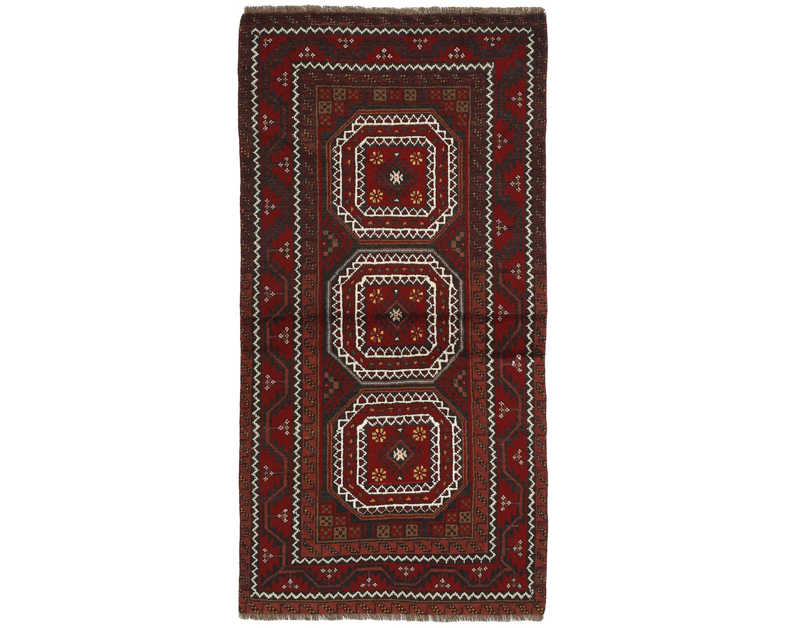 Balutch-mattorna kännetecknas av geometriska former och kompakta kompositioner. Mönstren består ofta av enkla geometriska motiv eller rutliknande uppbyggnader, och ibland förekommer även figurativa element som fåglar eller människor. Färgskalan domineras av djupa röda nyanser, mörkblått och vitt. Mattorna är handknutna av 100 % ull, med en knuttäthet som varierar mellan 50 000 och 150 000 knutar per kvadratmeter. Oanvänd.