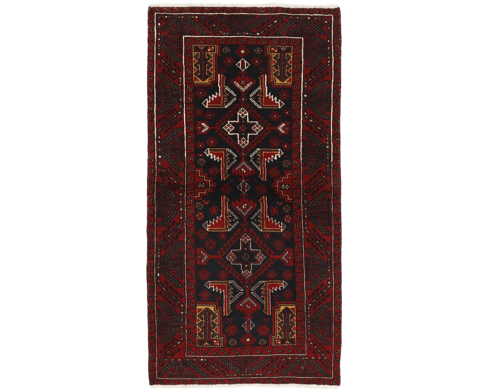 Balutch-mattorna kännetecknas av geometriska former och kompakta kompositioner. Mönstren består ofta av enkla geometriska motiv eller rutliknande uppbyggnader, och ibland förekommer även figurativa element som fåglar eller människor. Färgskalan domineras av djupa röda nyanser, mörkblått och vitt. Mattorna är handknutna av 100 % ull, med en knuttäthet som varierar mellan 50 000 och 150 000 knutar per kvadratmeter. Oanvänd.