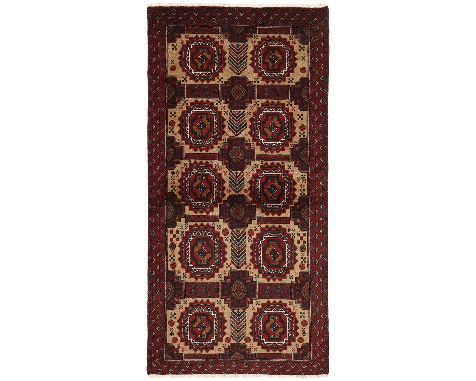 Balutch-mattorna kännetecknas av geometriska former och kompakta kompositioner. Mönstren består ofta av enkla geometriska motiv eller rutliknande uppbyggnader, och ibland förekommer även figurativa element som fåglar eller människor. Färgskalan domineras av djupa röda nyanser, mörkblått och vitt. Mattorna är handknutna av 100 % ull, med en knuttäthet som varierar mellan 50 000 och 150 000 knutar per kvadratmeter. Oanvänd.