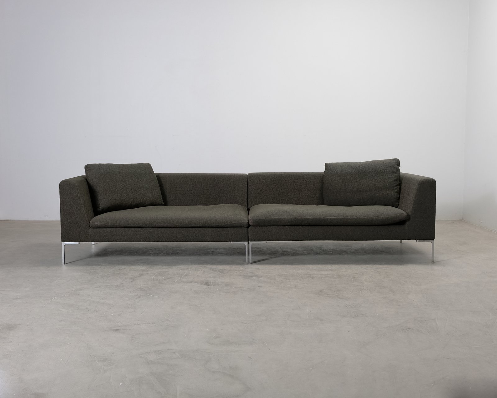 Charles är en rymlig och elegant 4-sitssoffa designad av den italienska formgivaren Antonio Citterio. Det mörkgröna tygtyget tillför djup och värme till rummet, och de generösa kuddarna erbjuder förstklassig sittkomfort. Soffans moderna och tidlösa design gör den till ett stilfullt tillskott i vardagsrum, lobbyer eller kontor. Små användningsspår, och fläckar på botten under kudden på en modul. Helhetsintrycket är bra.