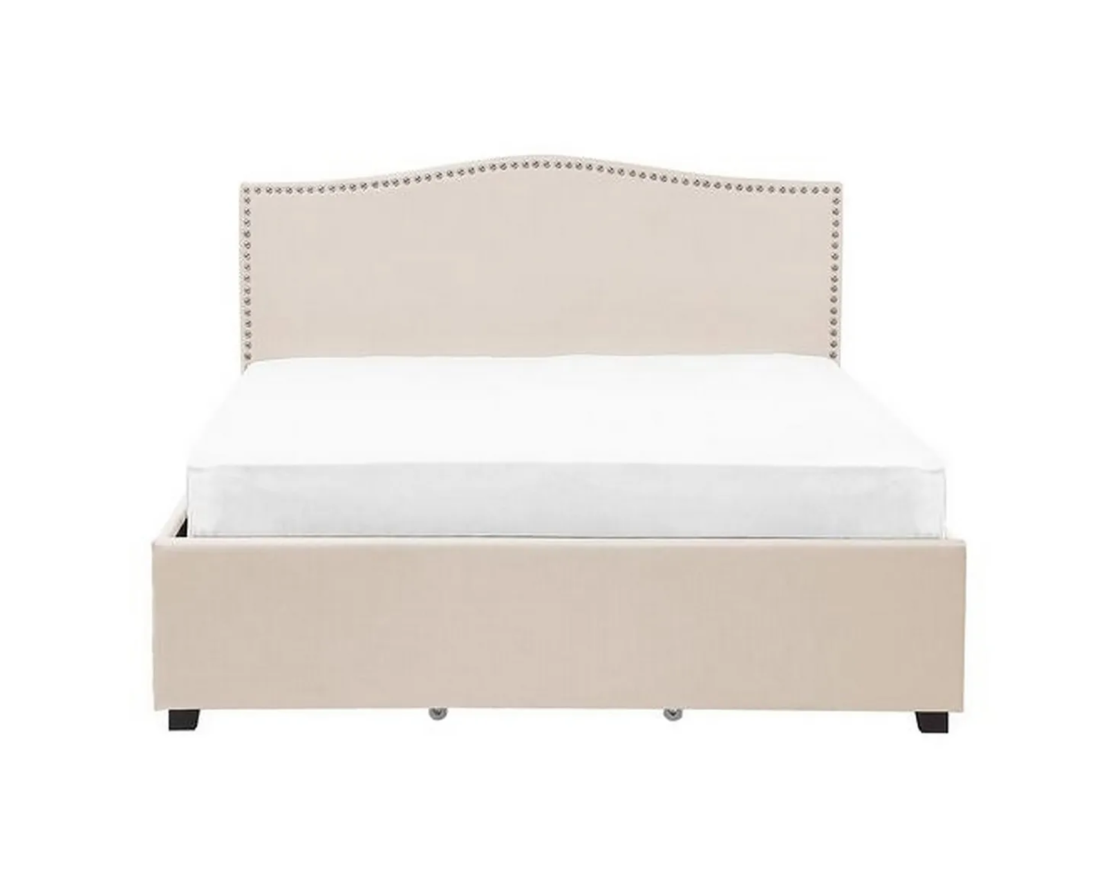En stilren sängram med beige tygklädsel och vackra detaljer som fulländar sovrummets eleganta utseende. Lådorna under ramen ger praktisk förvaring. Sängramen är tillverkad av trä och MDF. Inkluderar ram och sänggavel. En hörndel är något sprucken, men i övrigt är sängen i nyskick. Observera: madrass ingår ej.