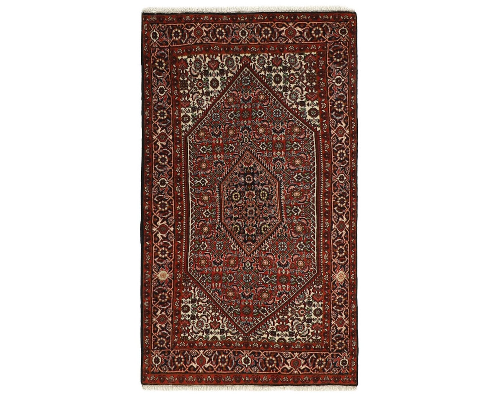 Bidjar Zandjan-mattorna är kända för sin exceptionellt täta och fasta konstruktion, som ger mattan en tung och kompakt känsla. De är handknutna i ull och kännetecknas av distinkta röda toner, ofta kompletterade med ljusare detaljer. Mönstren bygger vanligen på Herati-design. Den extremt täta knutningen gör mattorna styva, och de bör därför rullas med luggen utåt för att undvika skador på knutarna. Mattorna är tyngre och mindre flexibla än de flesta andra ullmattor. Knuttätheten ligger mellan 250 000 och 350 000 knutar per kvadratmeter. Oanvänd.