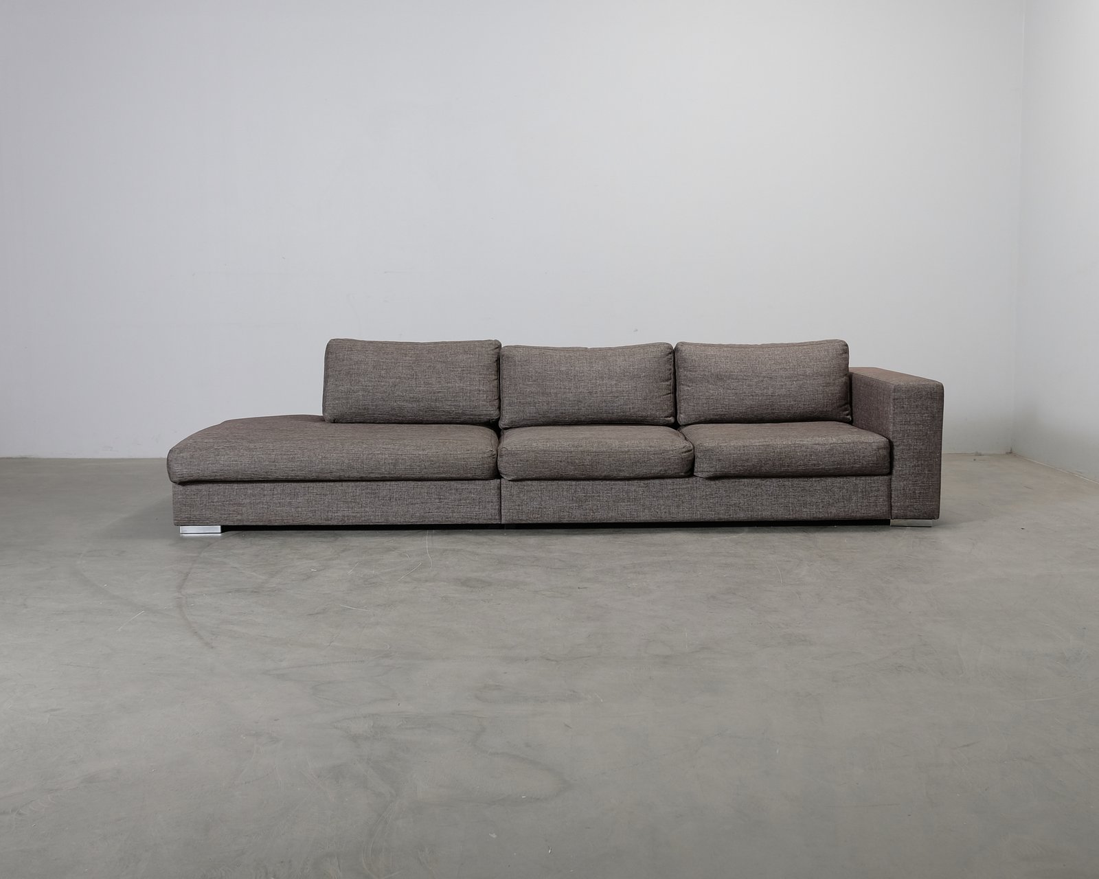 Stilren, rymlig och bekväm 4-sitssoffa med öppet avslut från Bo Concept. Brun tygklädsel. Soffans ram är böjd/sprucken på undersidan. Helhetsintrycket är bra.