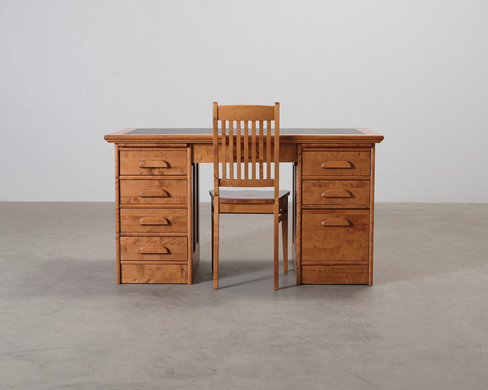 Boknäs skrivbord tillverkas enligt traditionella mönster. Förvaringslådor håller ordning på dina papper och verktyg. Grön skrivyta i textilskinn. Normalt bruksslitage, blekning och märken. Helhetsintrycket är bra.