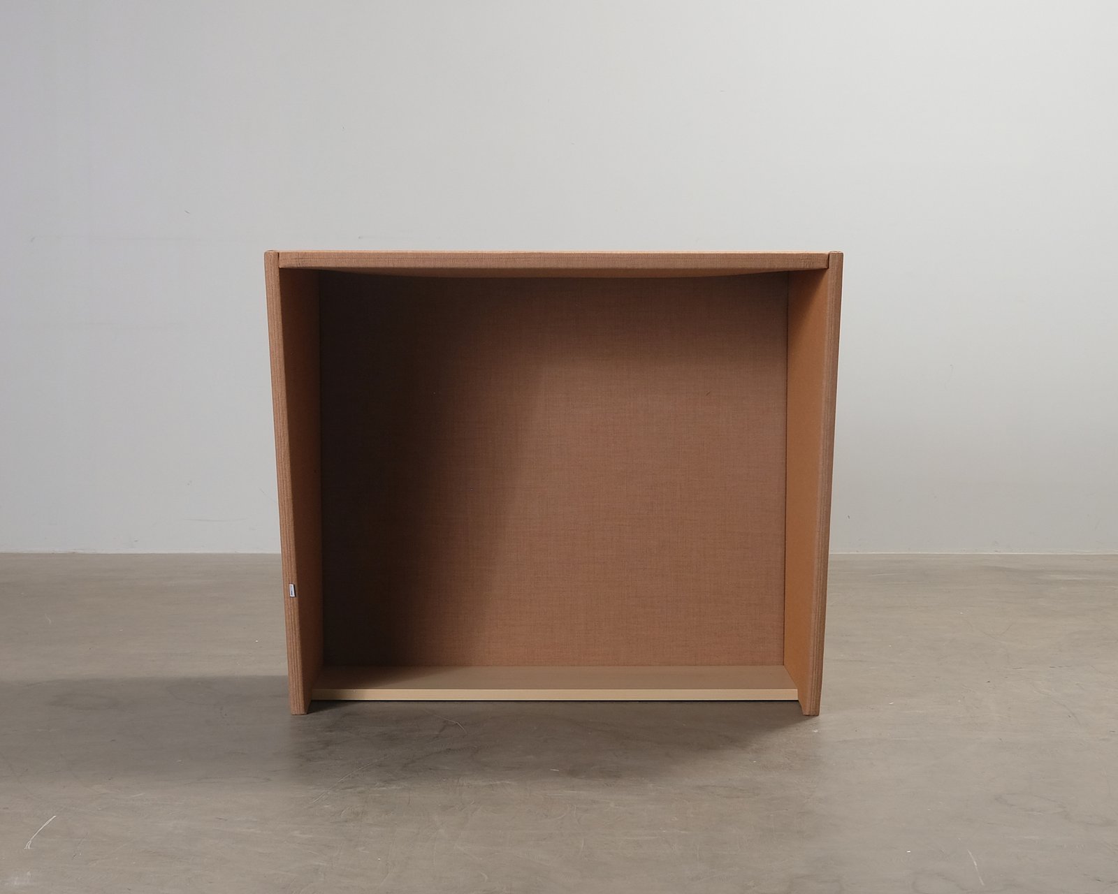 Väggmonterade skärmvägg ger avskildhet för telefonsamtal i kontorsmiljö. Klädd i brunt tyg. Tillverkad av Boom Interior. Små hål på ovansidan, men i övrigt är helhetsintrycket fint.