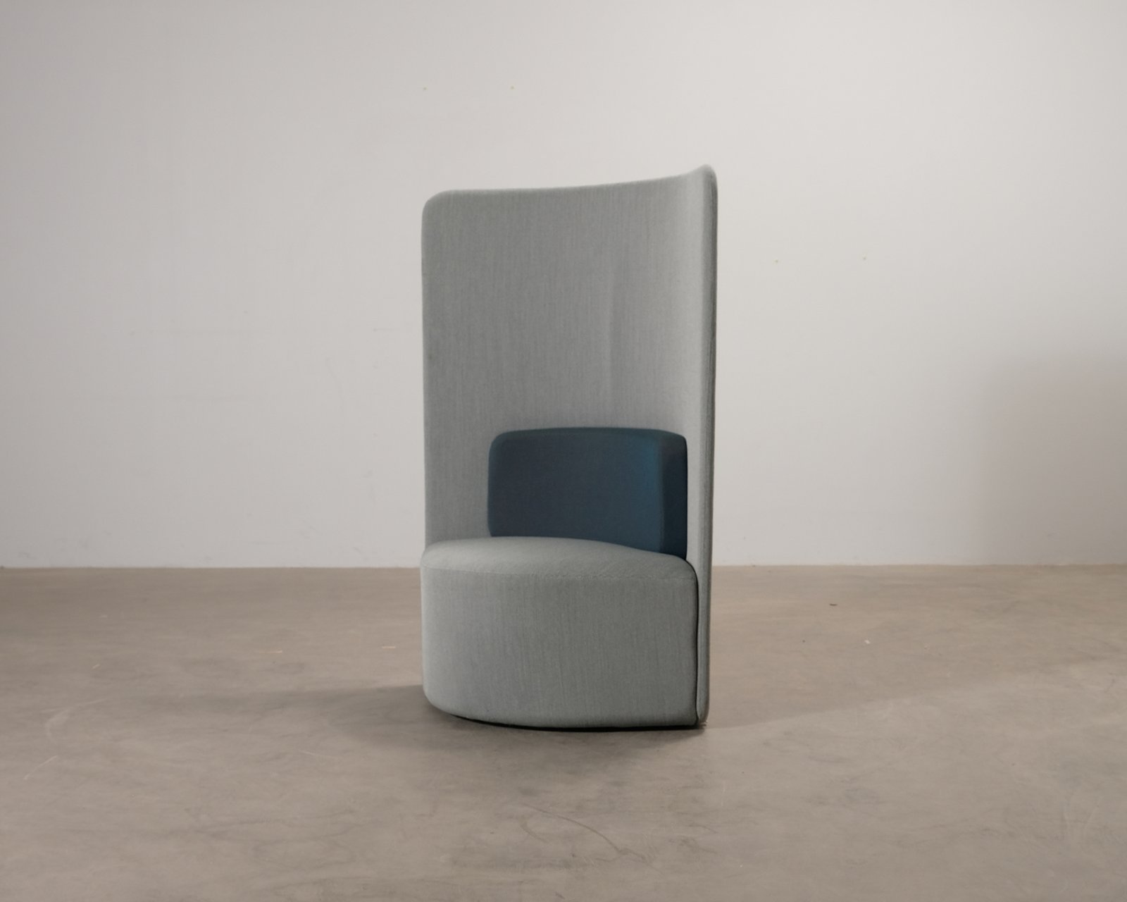 En stilren och praktisk Shuffle-stol för kontorsmiljön, med ett ryggstöd som isolerar ljud och även ger avskildhet vid arbete. Tillverkad av Boss Design. Små spår av användning. Helhetsintrycket är bra.
