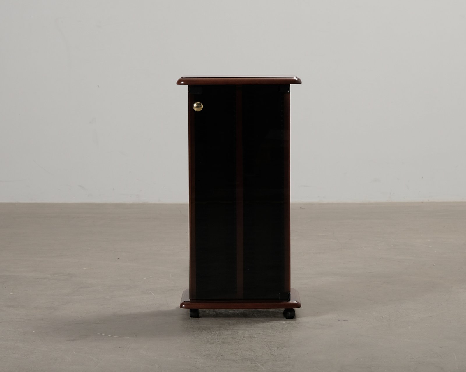Ett snyggt CD-stativ som ger gott om förvaringsutrymme för din musiksamling. Stomme i mörkt betsat trä. Helhetsintrycket är fint.