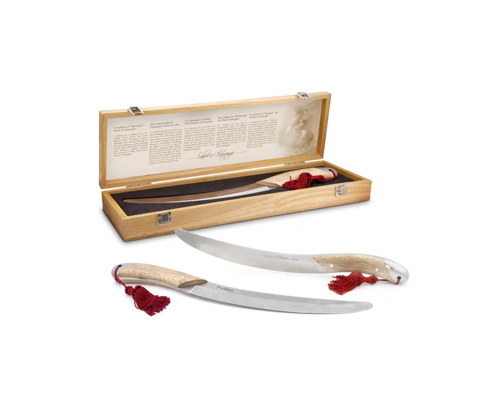 En vacker och dekorativ champagnesabel tillverkad av Pulltex, gjord av rostfritt stål och ek. Oanvänd