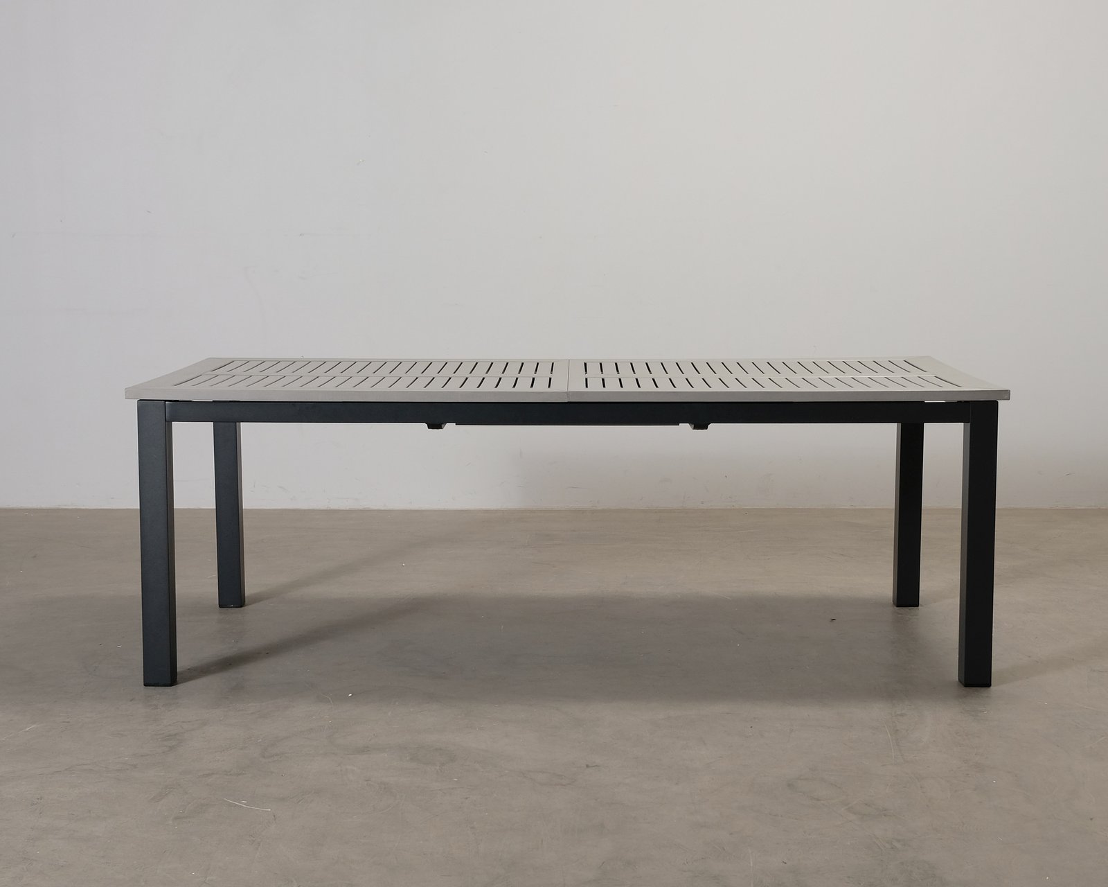 Comfort Garden märkets Monaco är ett modernt utdragbart matbord för utomhusbruk. Grå bordsskiva och ben i metall. Det finns några bucklor och ett hörn sitter dåligt fast, så bordet är lite vingligt, men defekten kan repareras. Helhetsintrycket är bra.