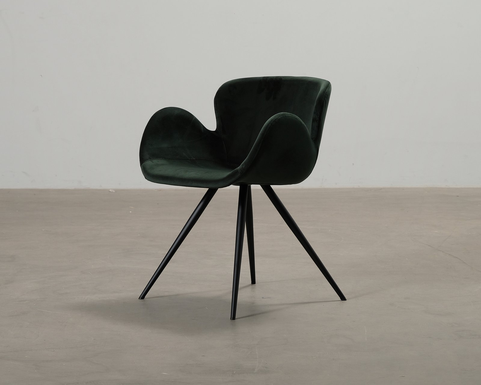Med sin kurviga och dramatiska silhuett blir Gaia stolen ett blickfång vart du än placerar den. Klädsel i grön sammet och ben i stål. Gaia är formgiven av Finn Nielsen för danska möbeltillverkaren Dan-Form. Produkten är oanvänd. Levereras omonterad.