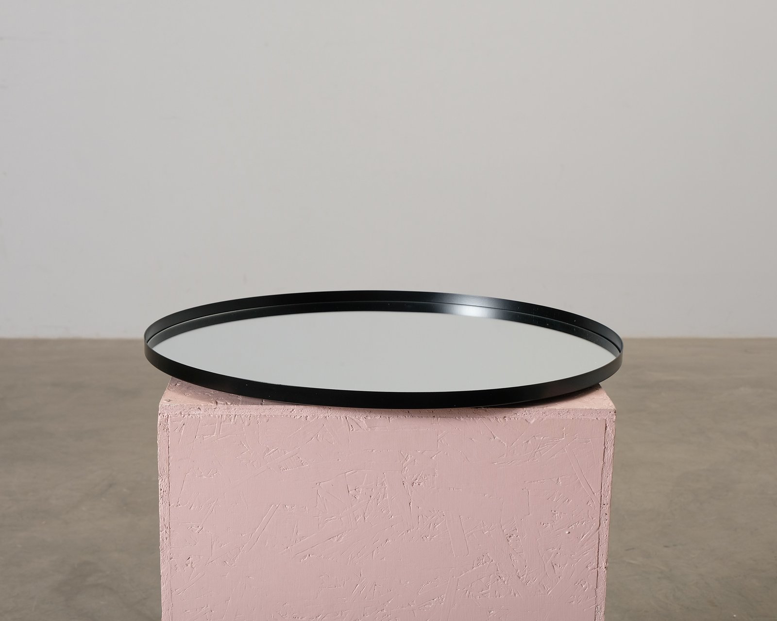 Den runda spegeln Edge M01 från Decotique skapar kontrast till de kantiga formerna i ditt hem och passar perfekt i hallen eller sovrummet. Svart metallram. Små spår av användning och en liten buckla i ramen. Helhetsintrycket är fint.