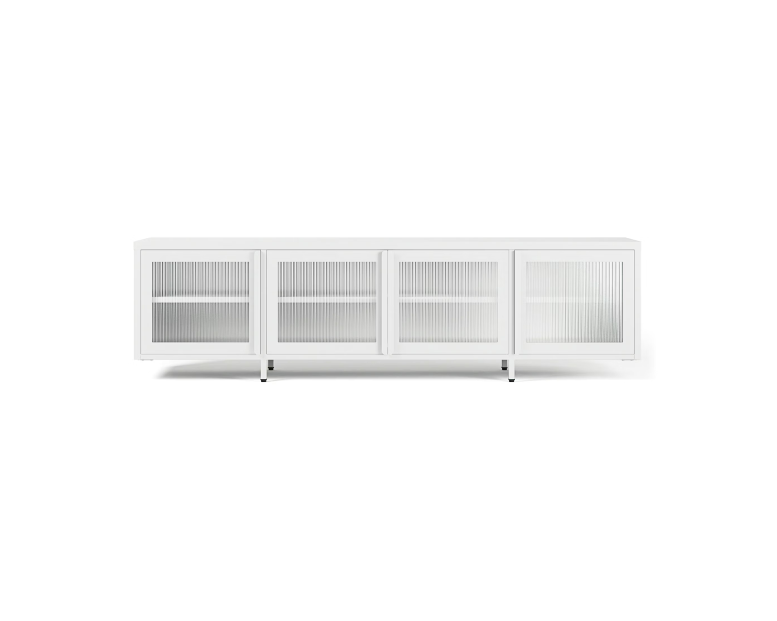 Department Store TV-bänk är en stilren och modern förvaringslösning för det skandinaviska hemmet. Den låga och långsträckta konstruktionen kompletteras av eleganta glasdörrar som ger möbeln ett lätt och luftigt uttryck. TV-bänken passar utmärkt i vardagsrummet eller som mediabänk, där funktionalitet möter minimalistisk estetik. En metallplatta har böjts tillbaka till sitt ursprungliga läge och har en liten repa, men i övrigt är produkten i nyskick.