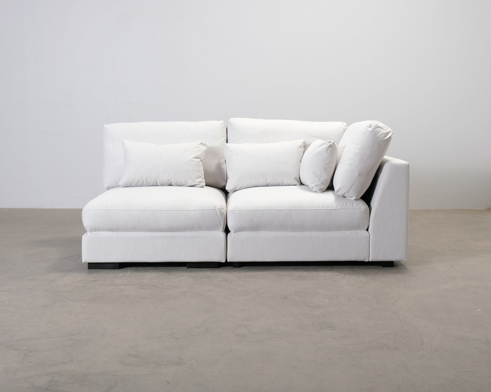 Stilren, tidlös och bekväm 2-sits Dubai-modulsoffa med ljus tygklädsel. Flera sprickor i ramen, men soffan känns tillräckligt stabil för användning.