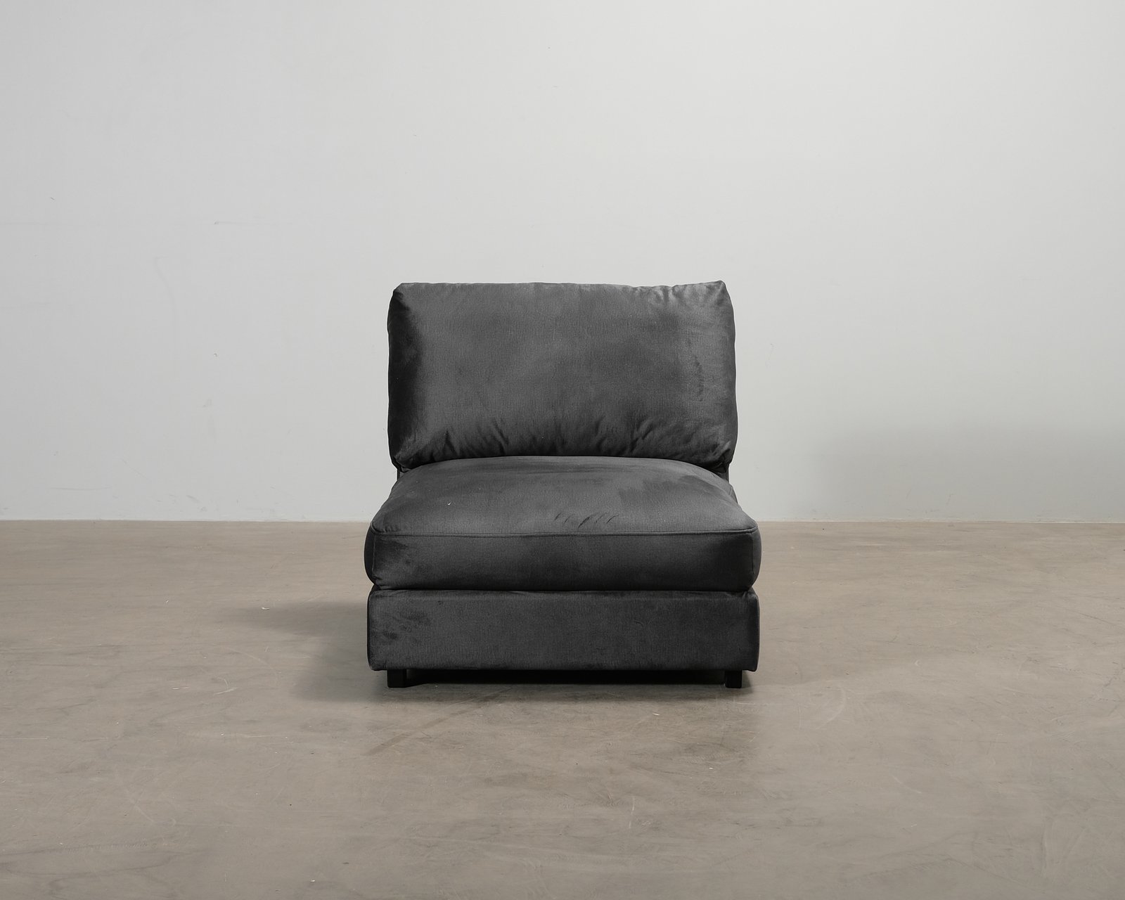 Du kan kombinera Dubai soffmodul med andra delar av setet eller använda den som en fåtölj. Klädsel i mörkgrå sammet och ben i trä. Normalt bruksslitage. Helhetsintrycket är bra.