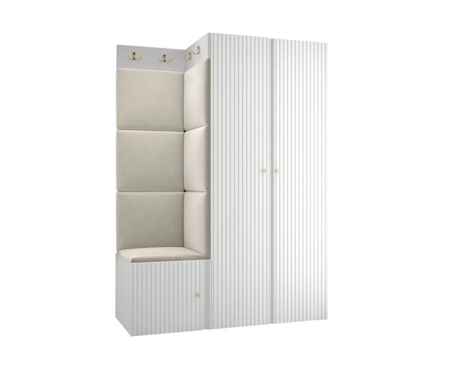 Praktiska och stilrena hallmöbler som kombinerar bänk, förvaringsutrymme och klädhängare. Tillverkad av laminat. Små ytskador. Helhetsintrycket är fint.