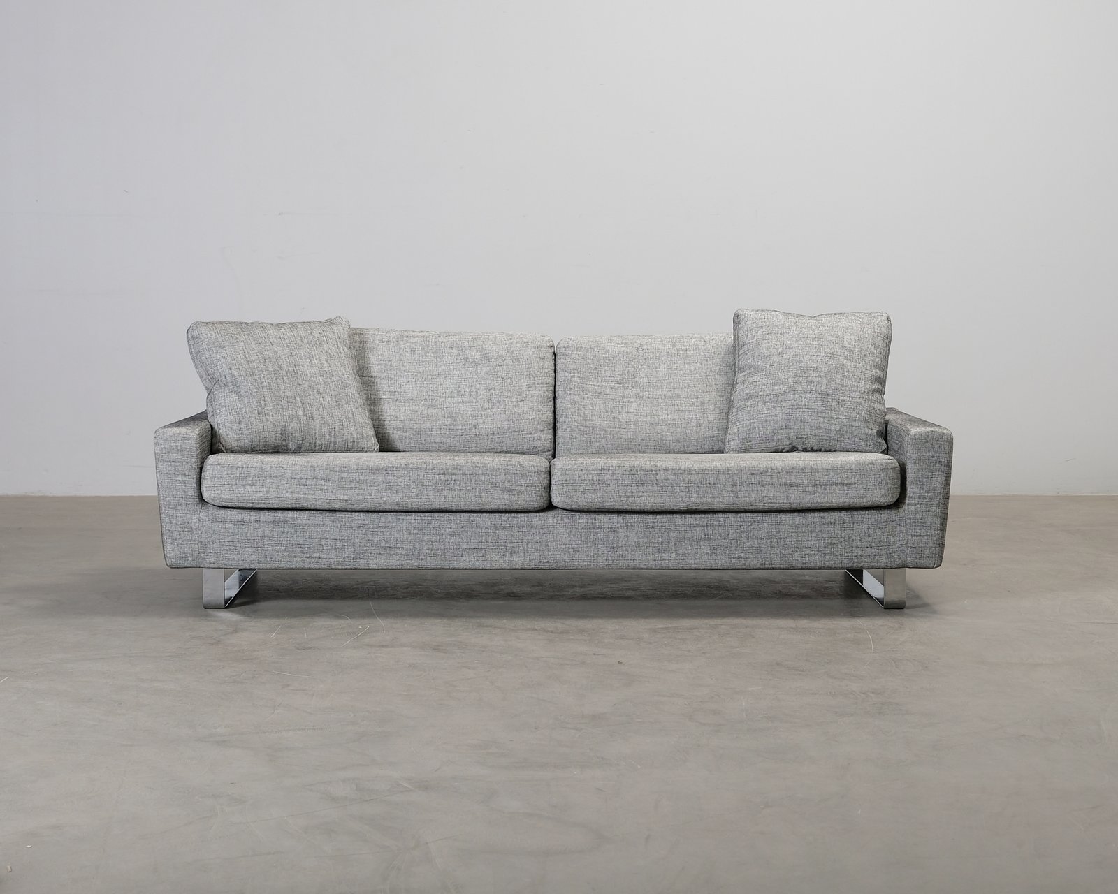 Högkvalitativ 2,5-sitssoffa från DUX med grå tygklädsel och metallben. Normalt slitage och ytsskador på armstödets innerhörn. Helhetsintrycket är bra.