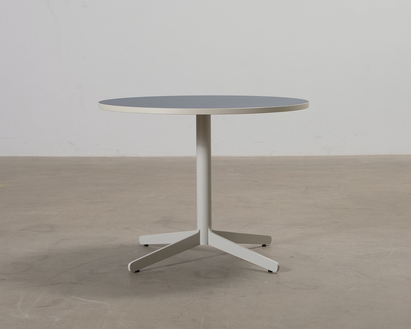 Feather är ett bord som kan användas i många olika utrymmen, med en minimalistisk stil som är lätt att gilla. Mörkblå bordsskiva och grå ben. Normalt bruksslitage. Helhetsintrycket är bra.