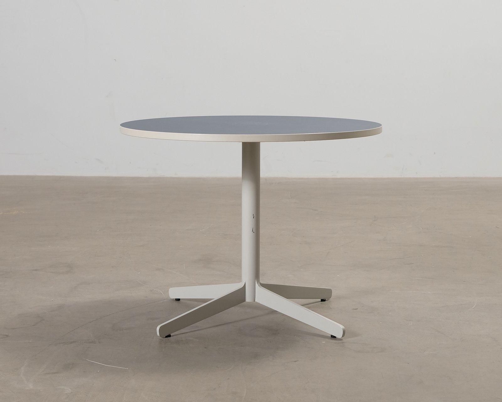 Feather är ett bord som kan användas i många olika utrymmen, med en minimalistisk stil som är lätt att gilla. Mörkblå bordsskiva och grå ben. Normalt bruksslitage och bucklor. Helhetsintrycket är bra.