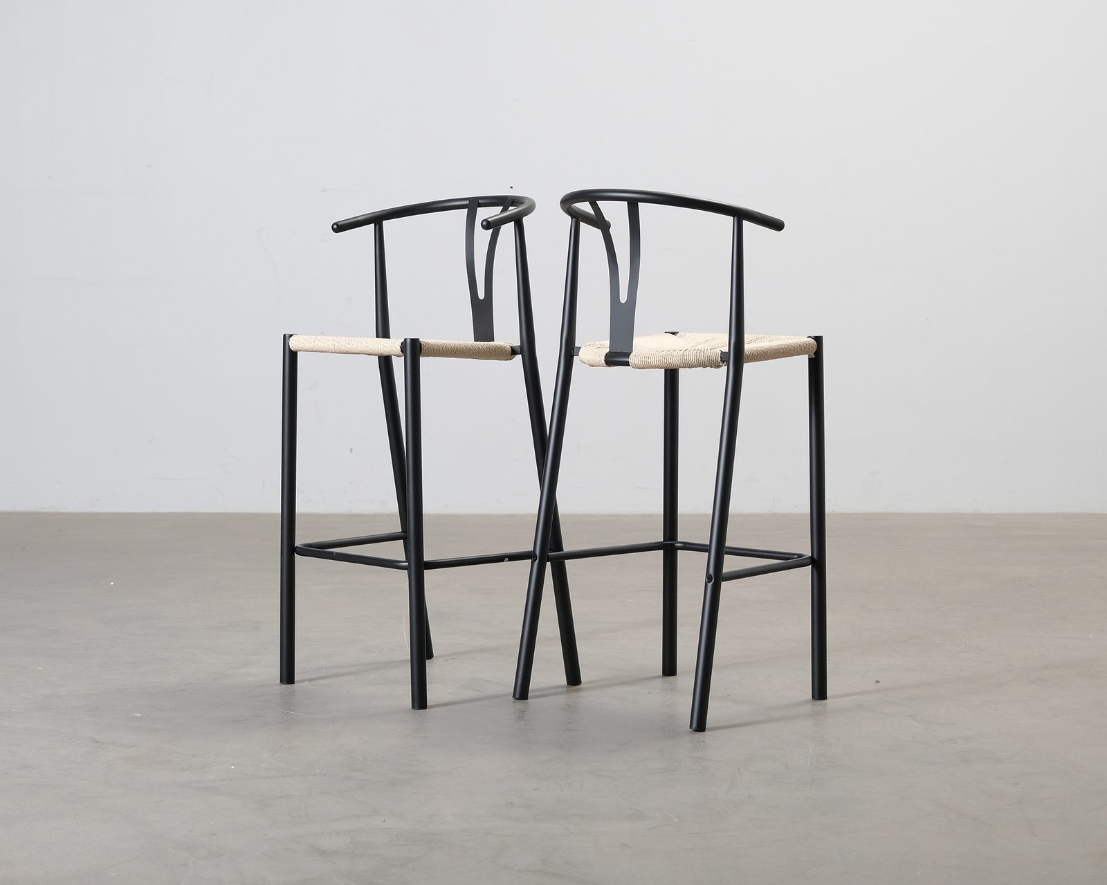 Trendig Elysia barstol. Stolen har en avskalad design, men sitsen i flätad rep ger stolen en personlig detalj. Stolarna är något vingliga, men i övrigt är helhetsintrycket fint.