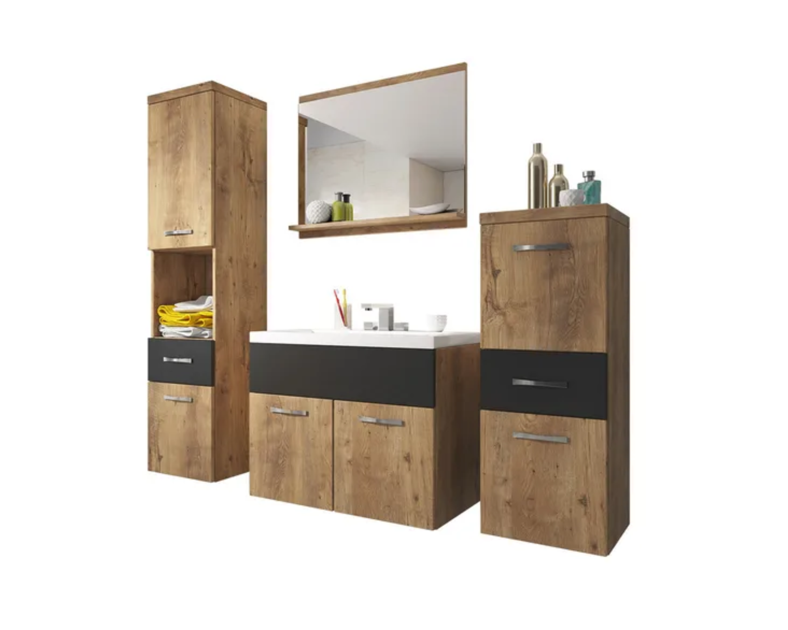 Badrumsetet Ericka är det perfekta valet när du vill skapa ett stilrent och funktionellt badrum. Innehåller ett tvättställsskåp med handfat och två skåp. Små märken i botten av handfatet. Färgen flagnar. Observera! Blandare ingår inte i setet. Helhetsintrycket är mycket bra.