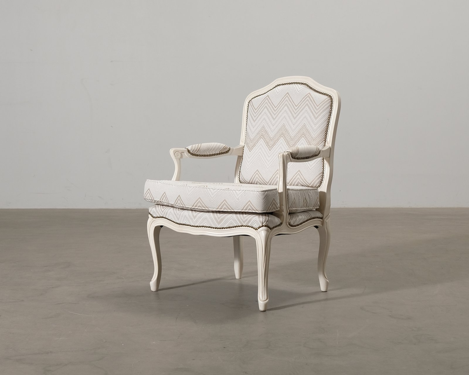 Fåtölj i rokokostil. Mönstrad tygklädsel och stomme i trä. Sprickor i färgen på andra bakbenet. Tyg och ram annars i gott skick.