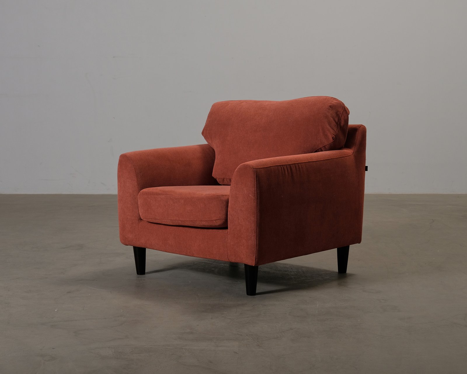 En bekväm och tidlös fåtölj med rött tygklädsel och svarta ben. Normalt bruksslitage och blekning av klädseln. Helhetsintrycket är bra.