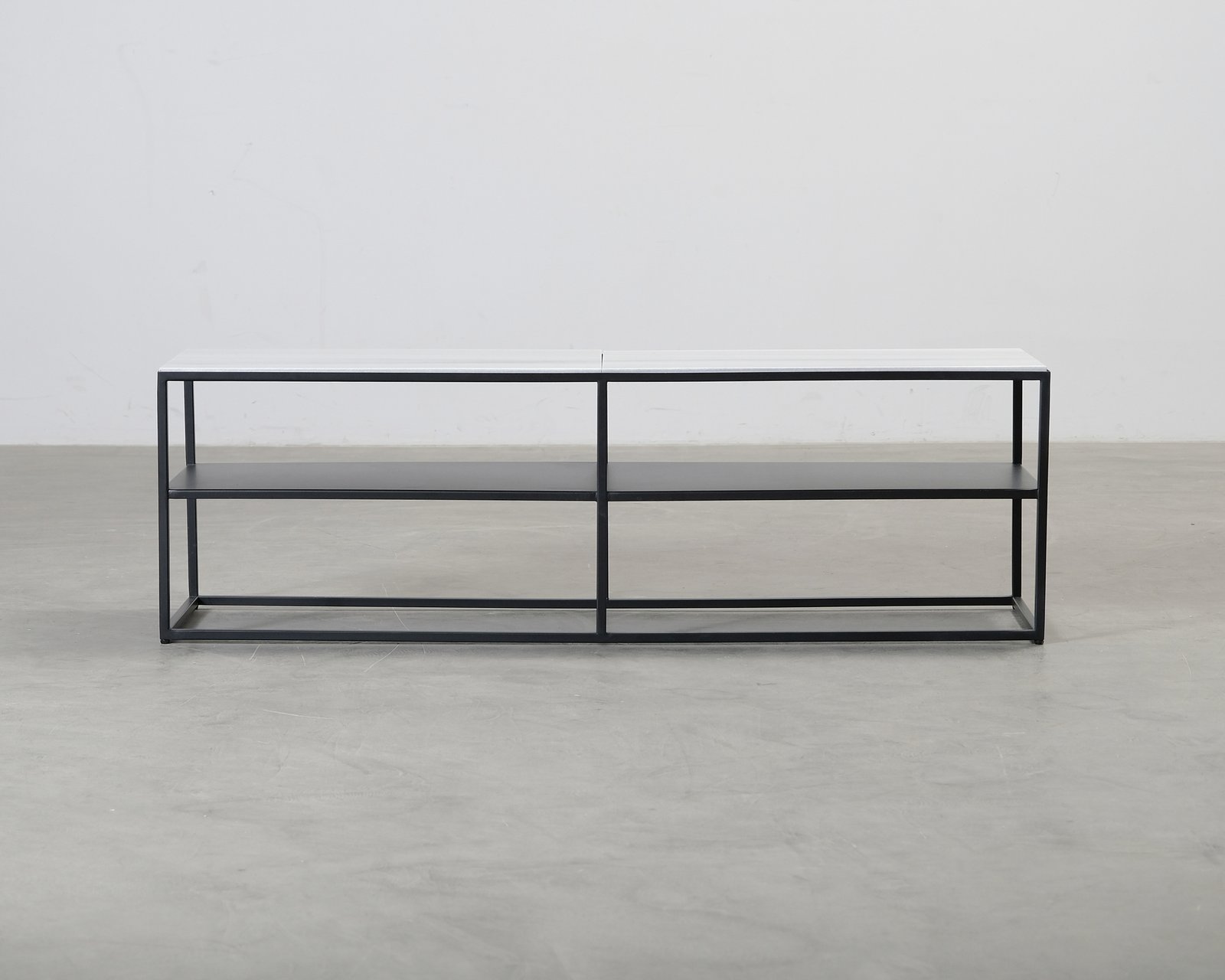 FeelDesigns Rondo är ett minimalistiskt sidobord / mediamöbel med stomme i metall och bordsskiva i vit marmor. Märken på ramen och bordsskivans nyans lutar åt grått. Helhetsintrycket är fint.