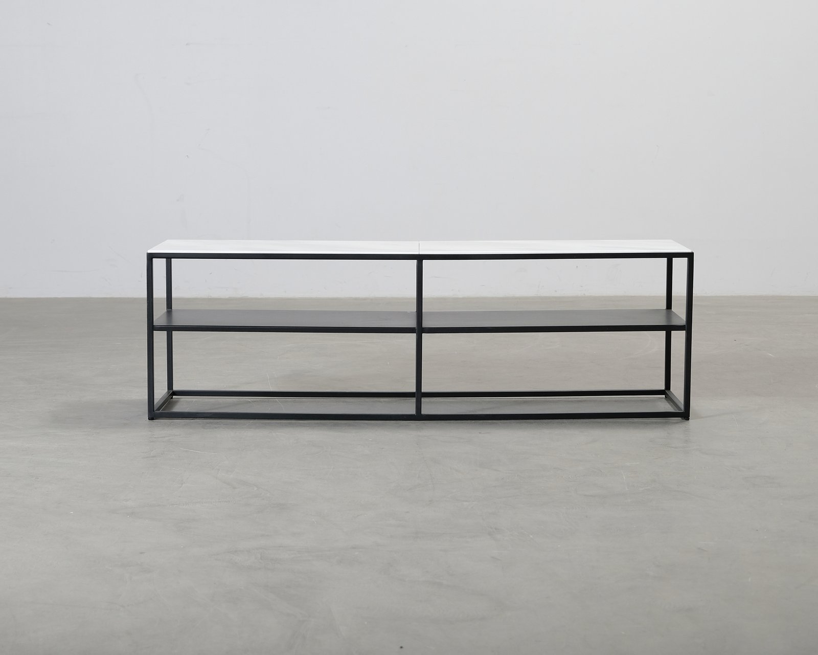 FeelDesigns Rondo är ett minimalistiskt sidobord / mediamöbel med stomme i metall och bordsskiva i vit marmor. Ljusare märken på ramen. Helhetsintrycket är fint.