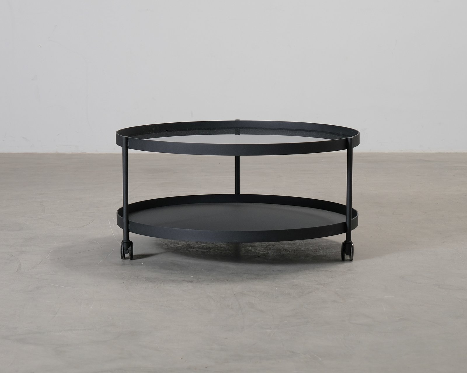 Runt soffbord från FeelDesign i svart. Den minimalistiska designen gör bordet lätt att kombinera med olika inredningar. Tillverkat i metall och glas. Lätta märken på stommen. Helhetsintrycket är fint.