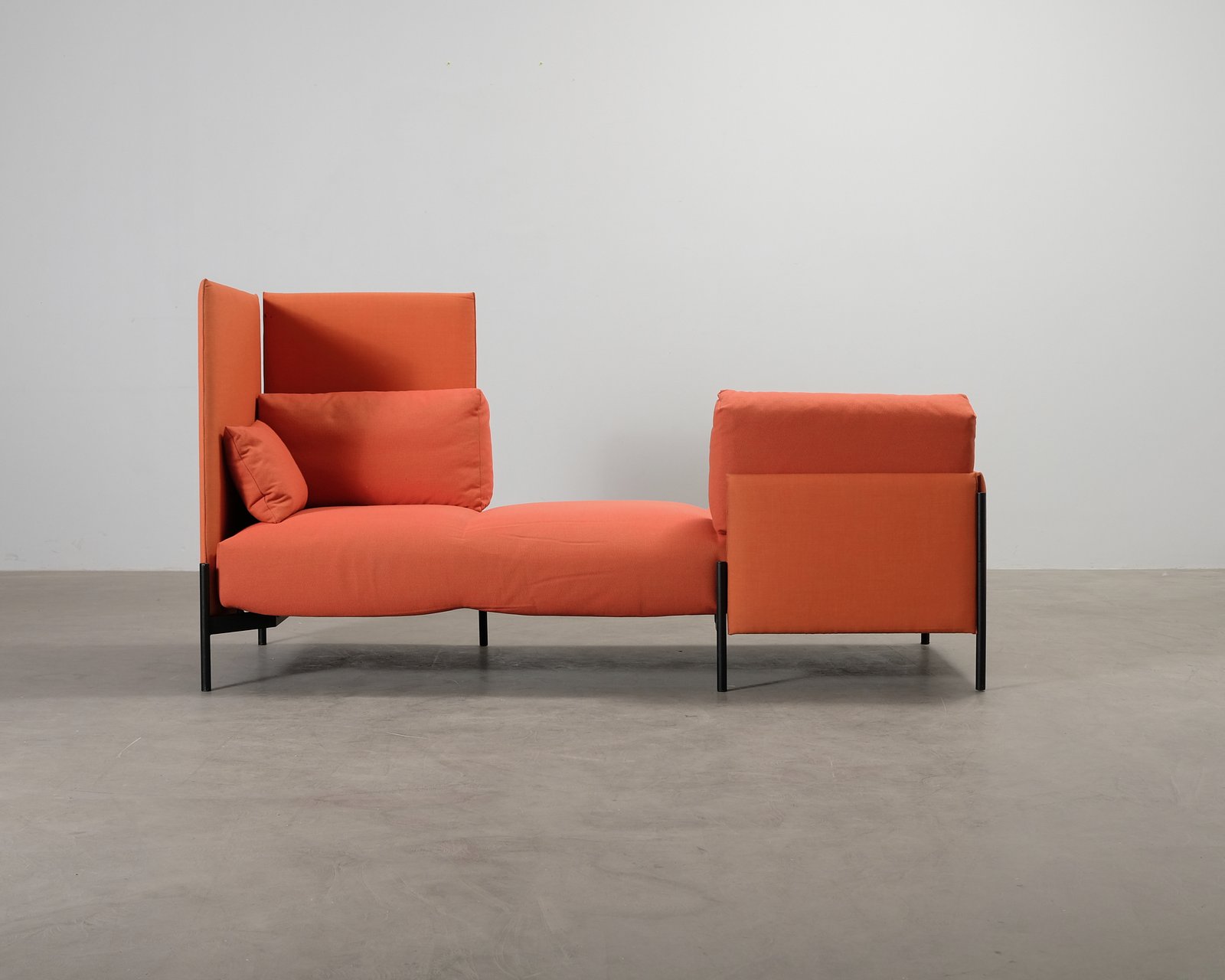 Fragment är designad av Todd Bracher för Fogia och är en underbart mjuk, kompakt och sympatisk soffa som är särskilt lämplig för kontor och offentliga utrymmen. Stommen i stål och bok garanterar en hållbar konstruktion och klädseln i orange tyg fulländar den eleganta looken. Små spår av användning och några fettfläckar på klädseln. En plugg saknas på ovansidan av ett av benens rör. Helhetsintrycket är bra.