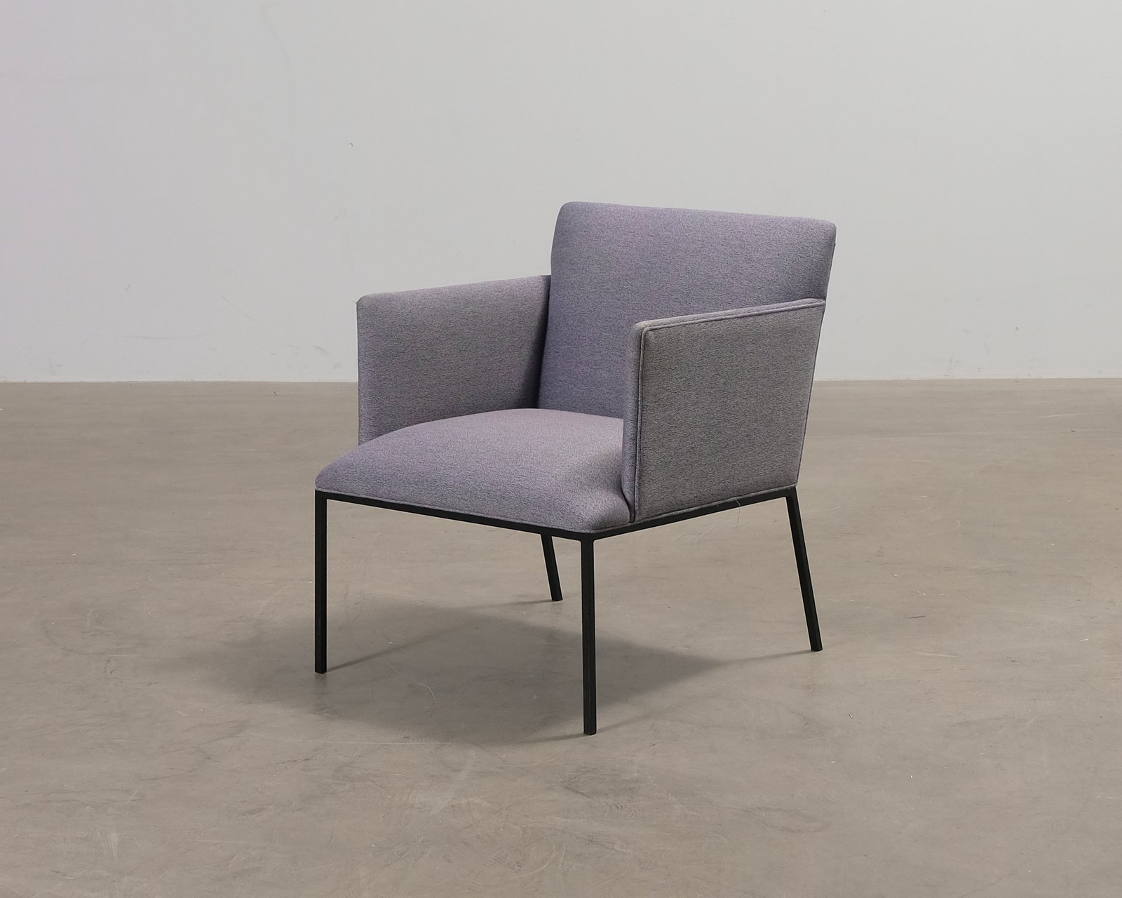 Den tidlösa fåtöljen Tondo från Fogia är perfekt för både kontoret och hemmet. Klädsel i blågrått tyg och ben i svart metall. Slitage på klädsel samt små hål och missfärgningar på armstöd. Benen saknar tassar. Stolen har tvättats.
