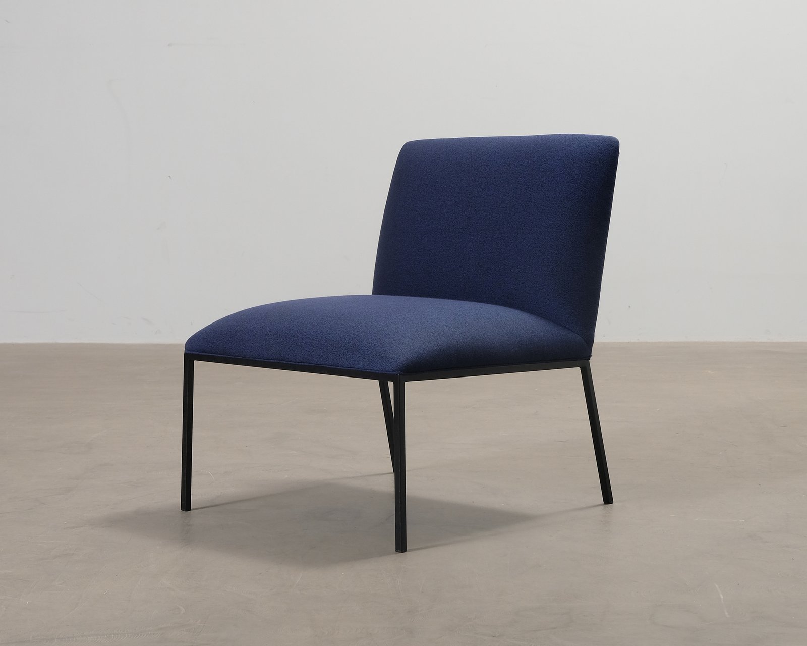 Den tidlösa fåtöljen Tondo från Fogia är perfekt för både kontoret och hemmet. Mörkblå tygklädsel och svarta metallben. Små spår av användning. Helhetsintrycket är fint.