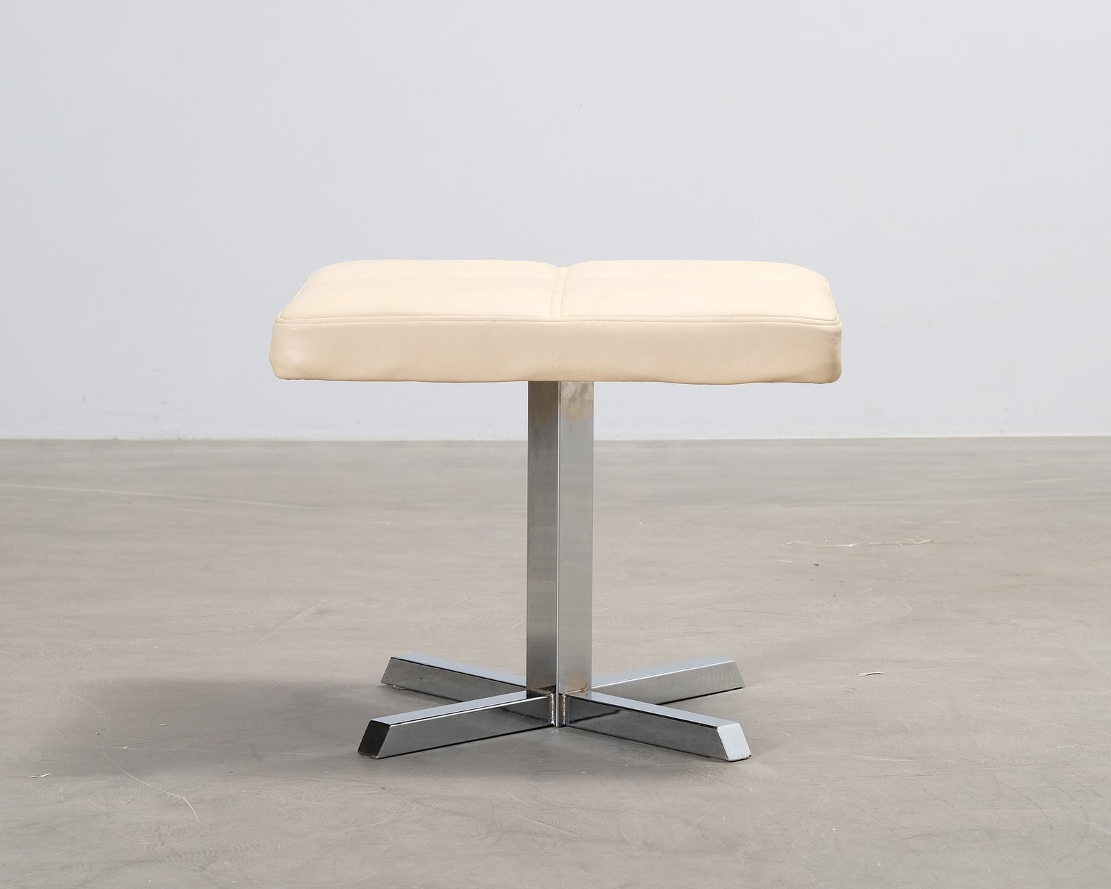 Fotpall klädd i gräddvit skinn. Kombinera fotpallen med en soffa eller en fåtölj Klädseln sliten. Repor på foten.